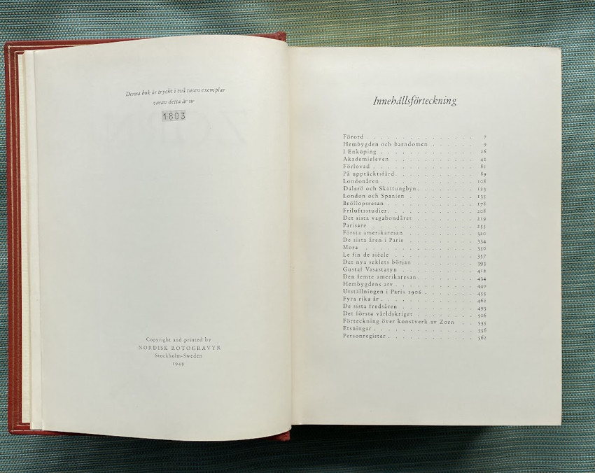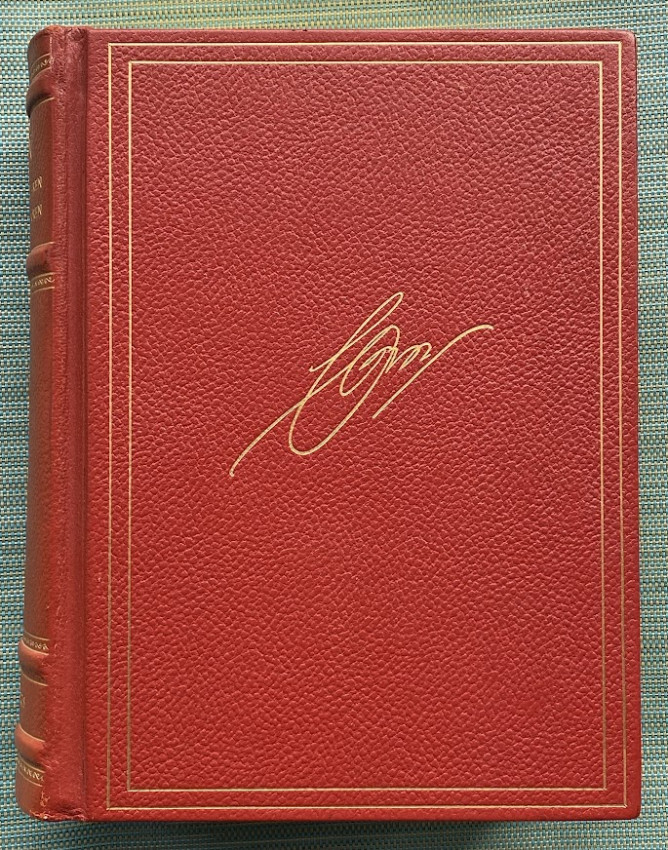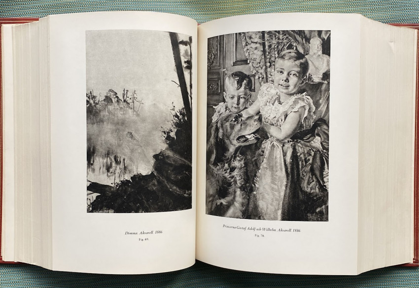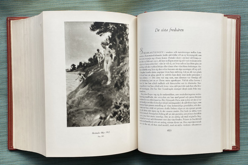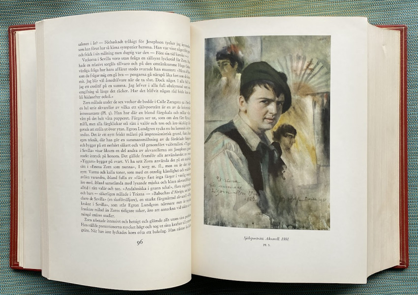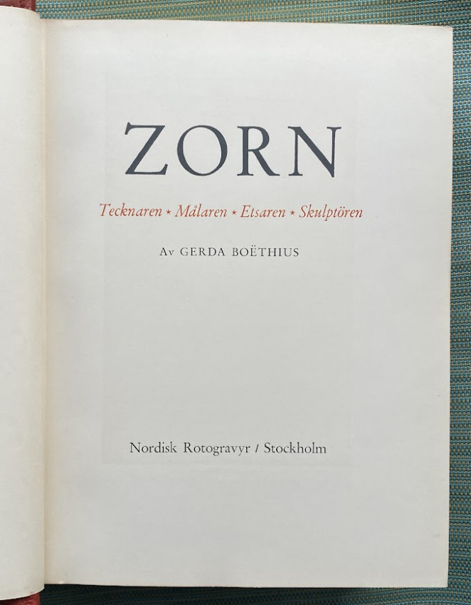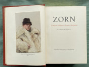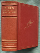 Anders ZORN (1860-1920). - Gerda Axelina Johanna BOETHIUS (1890-1961). Zorn Tecknaren Malaren Etsaren Skulptoren. Stockholm: Nordisk Rotogravyr, 1949. Quarto (11 ¼ x 8 ¼ inches; 285 x 210 mm). Pp. [1-]7- 579[-580]. Title printed in red and black. 37 tipped-in colored plates, 324 full-page illustrations, occasional uncolored small illustrations. Original brown/red leather binding by Nordiska Bokhandelns Bokbinderi of Stockholm, covers ruled in gilt, facsimile of Zorn’s signature blocked in gilt on the upper cover, spine tooled and lettered in gilt, gilt ruled turn-ins, top edge gilt (light soiling and fading to spine).