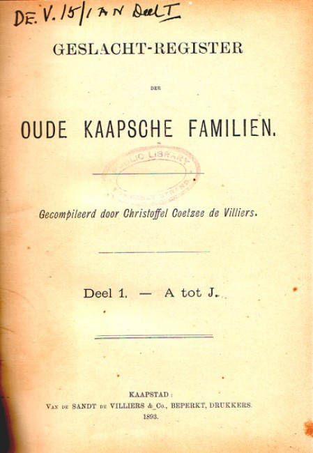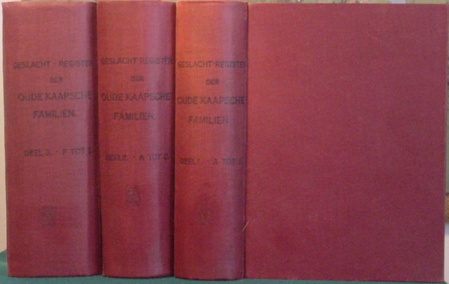 Monumental classic genealogy of the Cape families, a sought-after collectors' piece as well as a mine of information for genealogical scholars.Dutch text. 520+397+679 pp, ex reference library copies with stamp in prelims and handwritten ownership, otherwise very good condition in red cloth. A large and heavy set.