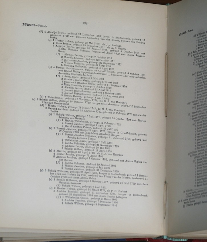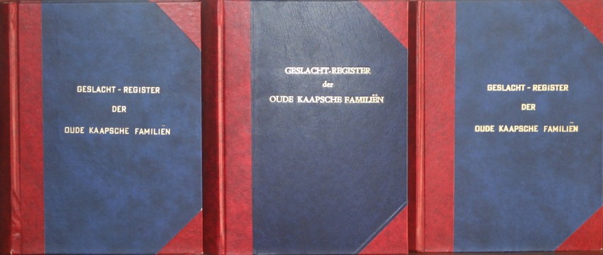 In three Volumes: Vol 1. xxx + 397, Vol 2. x + 679, Vol 3. x + 520 pages. Synthetic leather rebound, new end papers. Good+ copies of a monumental work on South African genealogy.