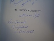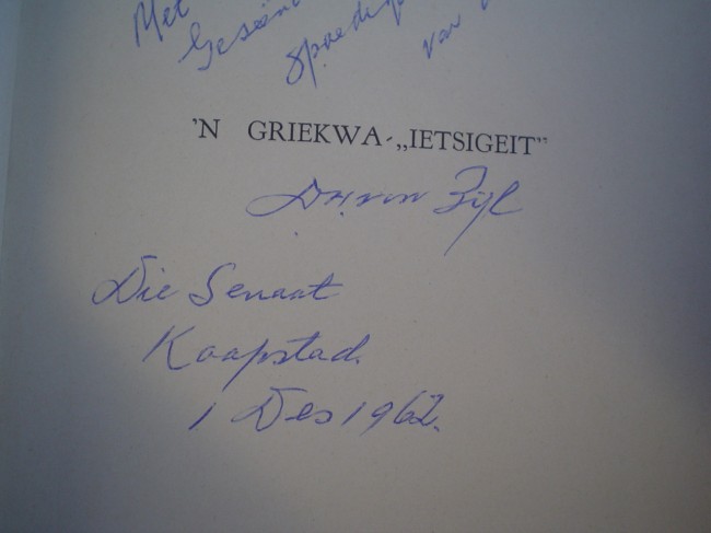 Doe omslag op foto is slegs 'n kleurkopie. Inskripsie voorin aan spesifieke persoon gerig en Van Zyl het onderaan geteken.