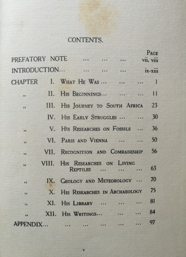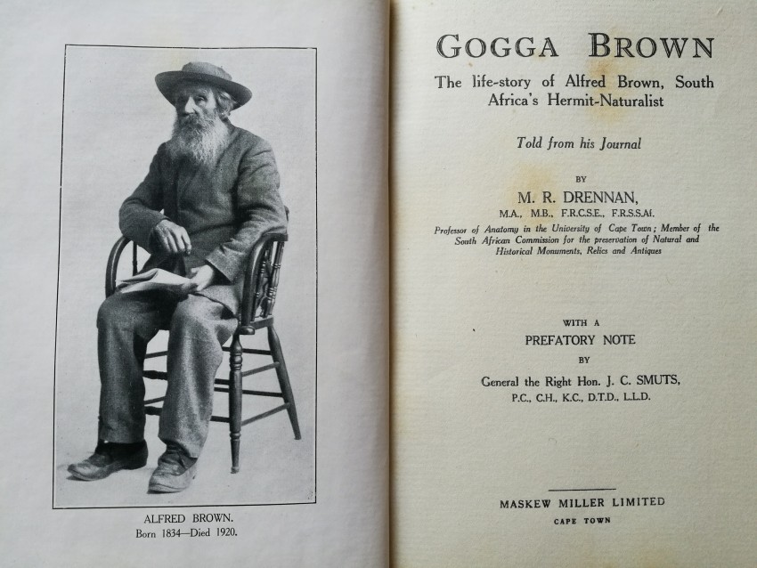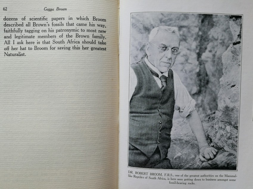 Cream card endpapers with a photograph and lettering in black on the front cover, green cloth-boards with publisher's logo and lettering in in black on the upper board, plain endpapers, portrait photograph on art-paper as frontispiece, xiii pp of prelims, including Smuts's prefatory note and the author's introduction, + 99 pp of text and appendix printed on laid paper and listing fossil animals discovered by Alfred Brown, many of them named for the celebrated archaeologist Dr Robert Broom to give them more authenticity than Brown + 6 additional inserted plates on art-paper, including one of Alfred Brown's 15 volumes of folio journals.