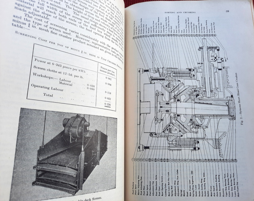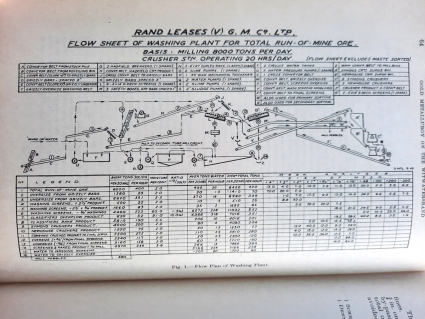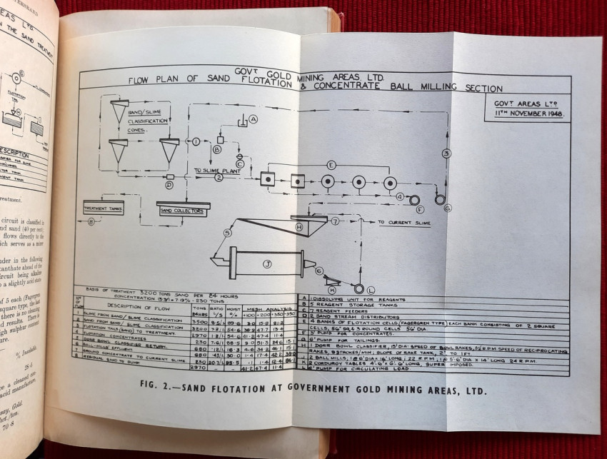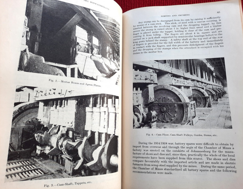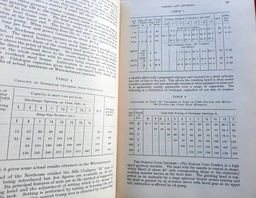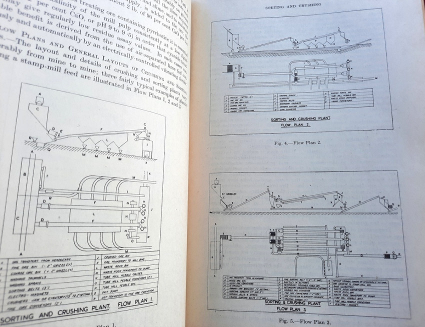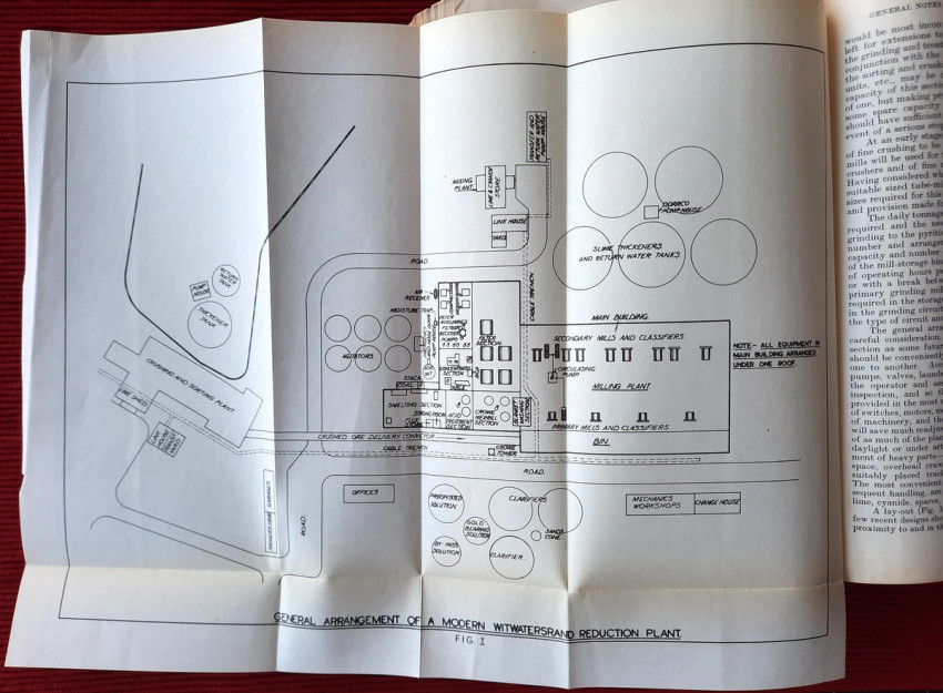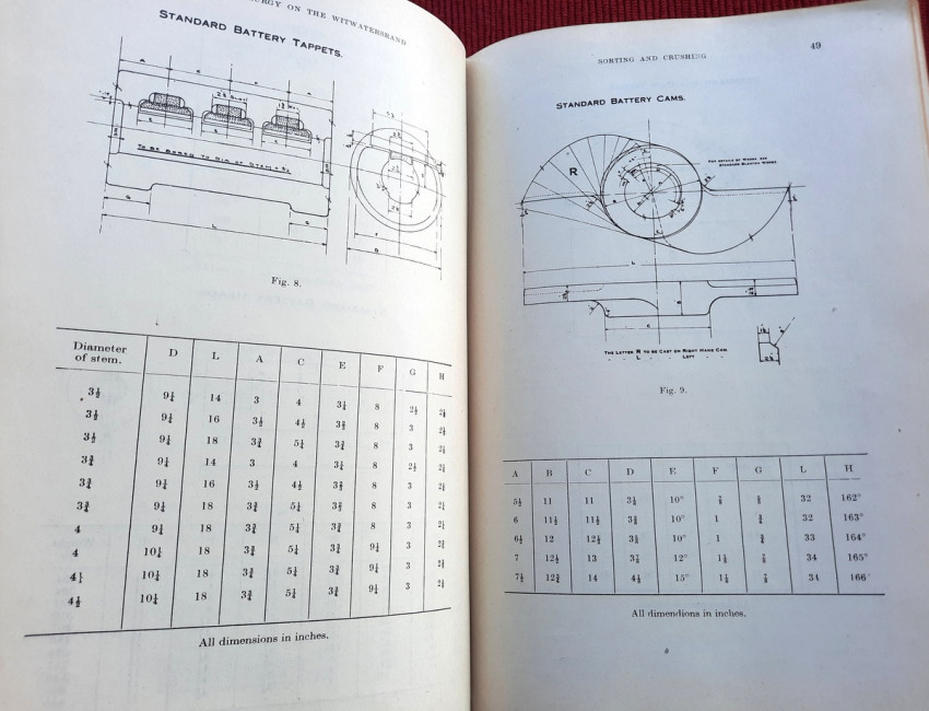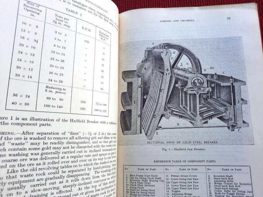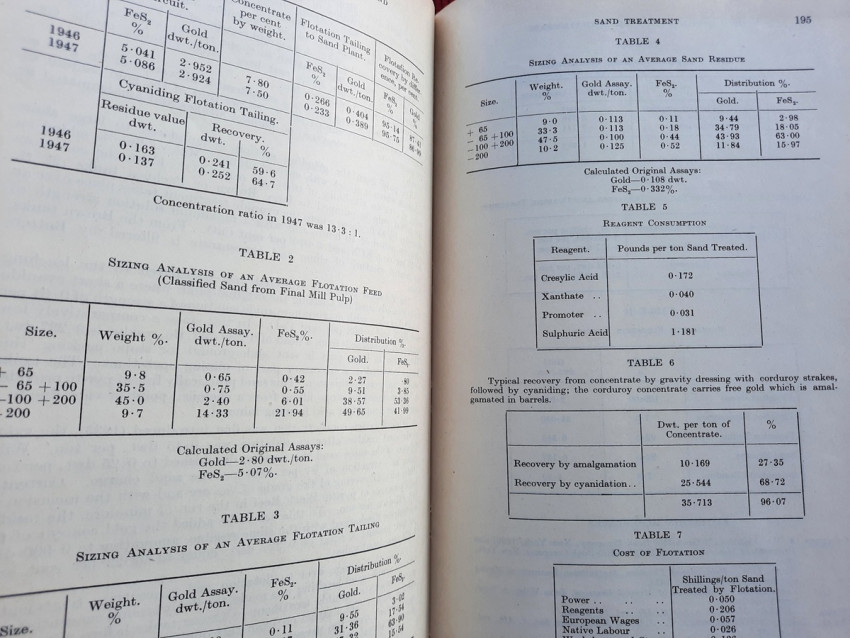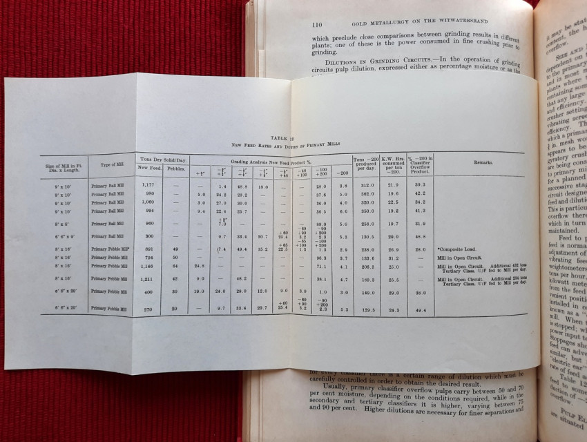 Detailed volume on South African gold mining practices. Includes sections on sorting and crushing, tube-milling and ball-milling, slime treatment and many other processes. With numerous B&W illustrations, plans and tables (10 folding), charts, statistics, formulas, figures, etc.