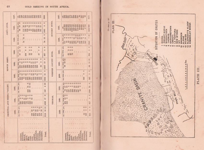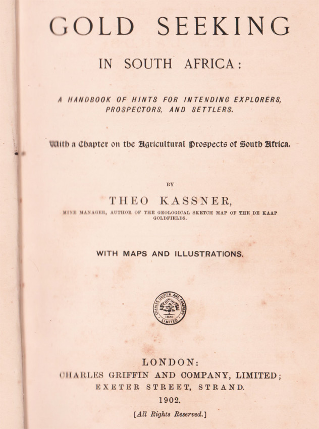 Mendelssohn (Sidney) South African Bibliography vol 1 page 804: Much information is afforded regarding gold reefs of every formation, and this is supplemented by a number of sketches which intelligently illustrate the subject, and instructions are given showing the novice how to " pan," or " sink a shaft," and do many elementary things in his research for valuable minerals. The various goldfields of Africa are described not only the banket reefs of the Rand, but those in less known districts, and there are many maps, plans, and drawings illustrating the different sections and formations of the gold belts.