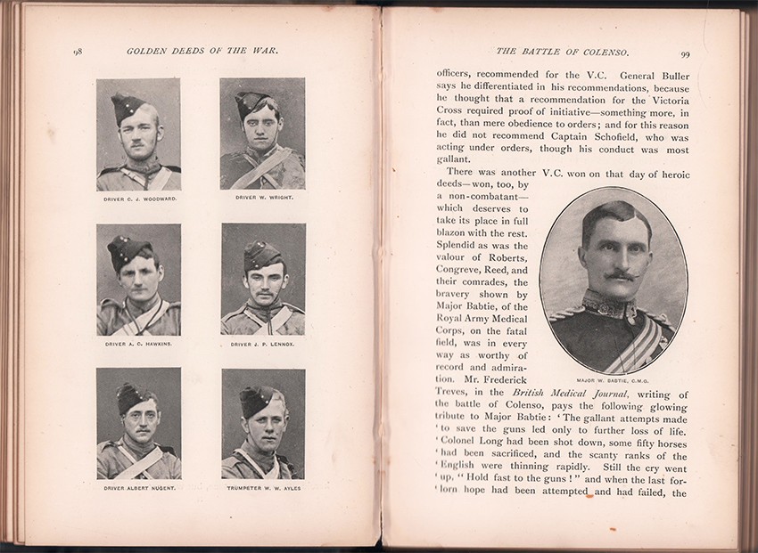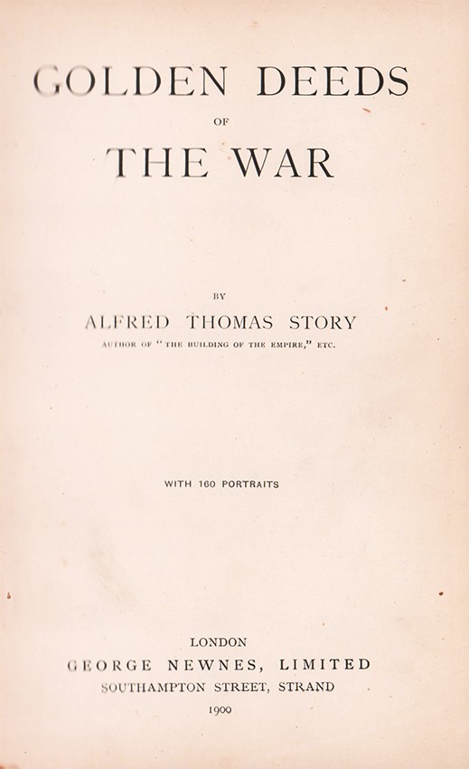 Mendelssohn (Sidney) South African Bibliography volume 2, page 444: A list, in chronological order, of some of the " brave, devoted, and daring acts " performed during the South African War, 1899-1902. There is an account of some of the individual acts of heroism, and the volume contains 160 portraits and an index.