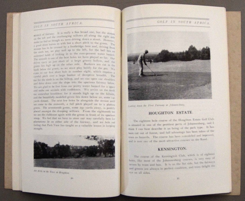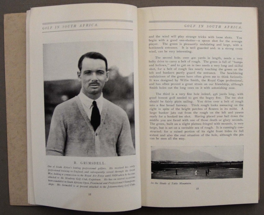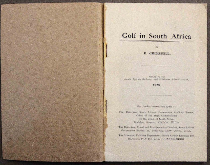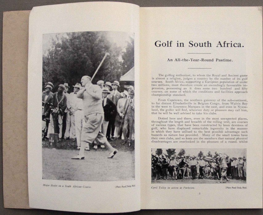 On offer is his scarce 95pp. softcover booklet "Golf in South Africa" in the original illustrated wraps. It is extensively illustrated with black and white photographs of South Africa's golf courses. I have traced a 1936 copy of this title but have been unable to find a copy, or reference to, this 1928 edition.