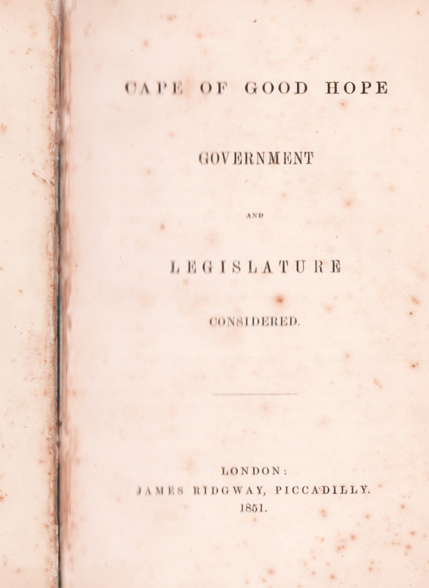Mendelssohn (Sidney) South African Bibliography Vol 1 page 287: This work reproduces articles and letters to the Cape Monitor from October 18, 1850 to January 31, 1851, dealing with the constitutional crisis in the Colony...The pamphlet contains the Report of the Government Commissioners....also the draft constitution prepared by the seceding elective members of the Council, Messrs. Stockenstrom, Fairbairn, Reitz and Brand.