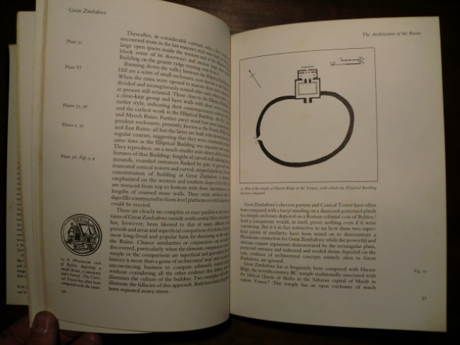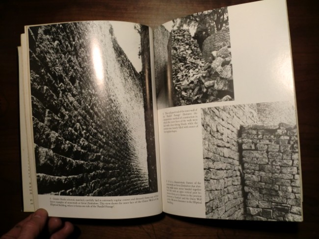 Guide To The Zimbabwe Ruins: softcover booklet (stapled) in very good condition; felt pen price on front cover, slight water-stain on lower page edges, not affecting text), 55pp, 3 fold-out maps (Sketch Map of the Ruins, The Elliptical Building or 'Temple', and The Acropolis), printed by Chronicle, Bulawayo, 19/10/51 for The Department of Public Relations on behalf of The Commission for the Preservation of Natural and Historical Monuments and Relics.