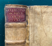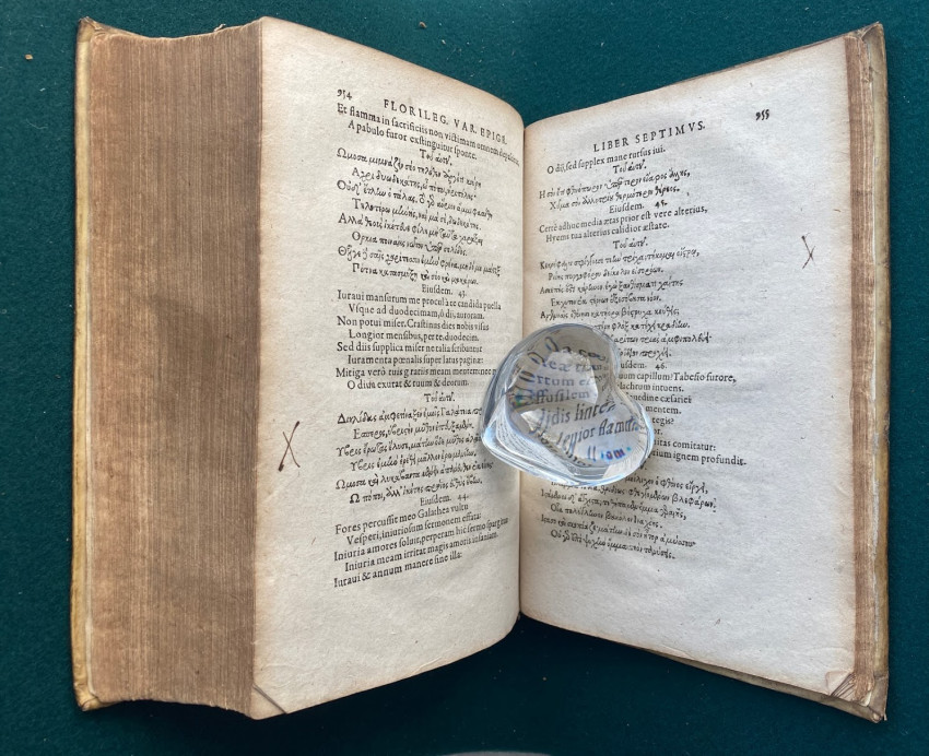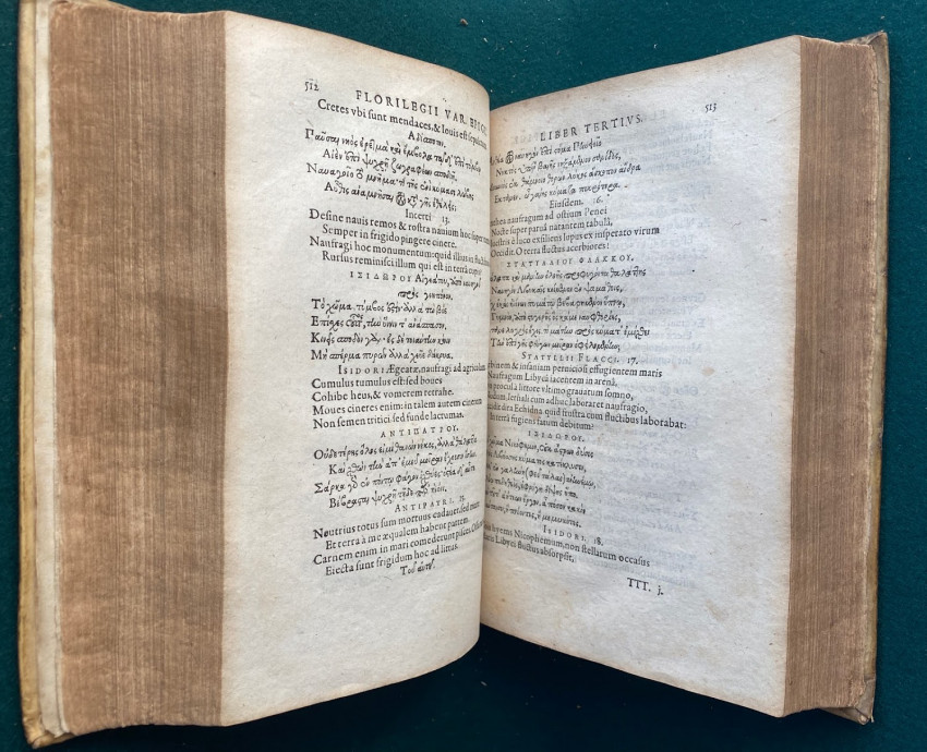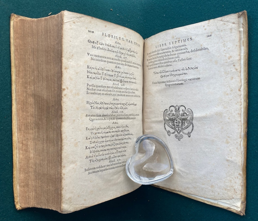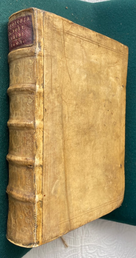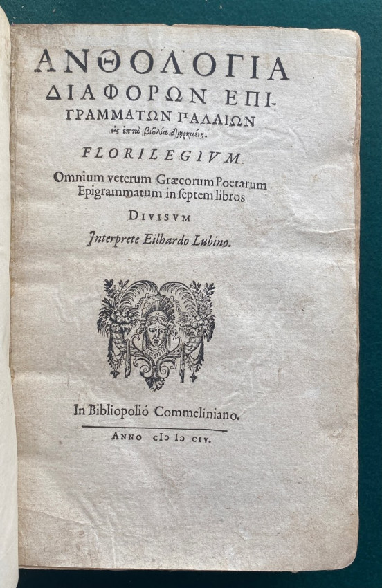 [Greek anthology of poetry, in Latin & Greek]. [In Greek, here transliterated as : Anthologia diaphoron epigrammaton palaion, eis hepta Biblia dieremene]. Florilegium omnium veterum Graecorum poetarum epigrammatum in septem libros divisum /; interprete Eilhardo Lubino. [Heidelberg] : In Bibliopolio Commeliniano, 1604. Quarto (9 ¼ x 6 ¼; 235 x 158mm), pp. [i-viii; 1-]1011[-1012]. (Title with small horizontal strip excised from upper blank margin and also backed with thin paper probably at an early date, a number of early manuscript ink crosses to blank margins apparently indicating chosen passages). Contemporary vellum over pasteboard (rebacked, old spine laid down, ties laid down).