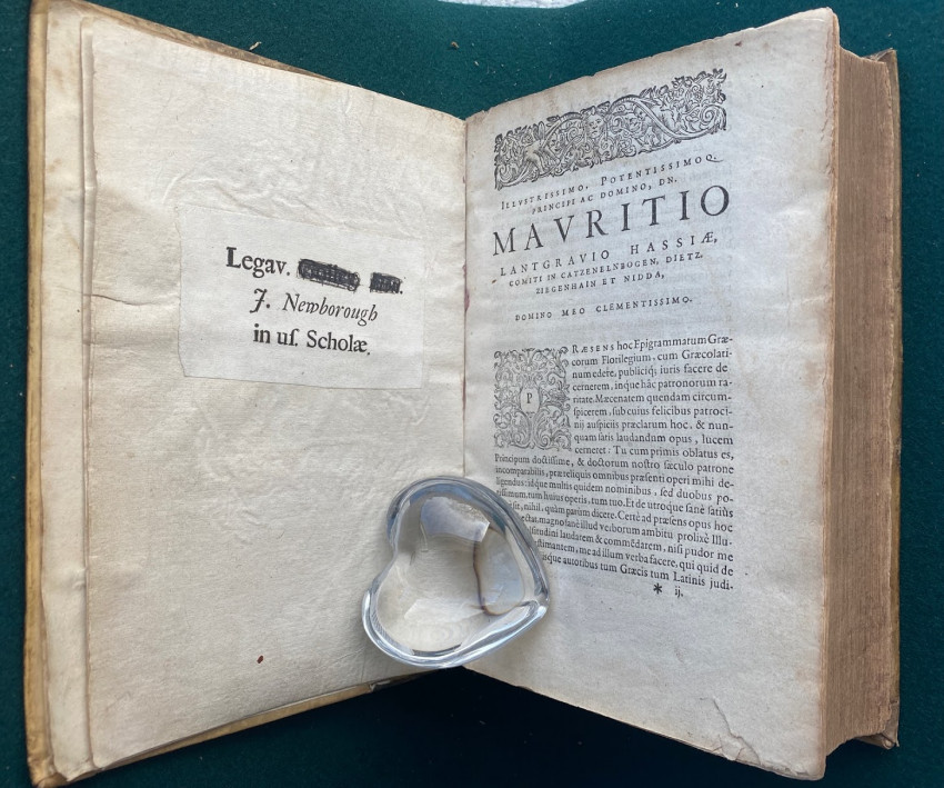 An early ex-library book from Eton. The library currently has another incomplete copy of this work, but the label in the present copy suggests that it was given to or purchased for the Eton College library between 1690 and 1711, which was when John Newborough served as Headmaster.For the other example which is currently in the library, see https://catalogue.etoncollege.com/B19231