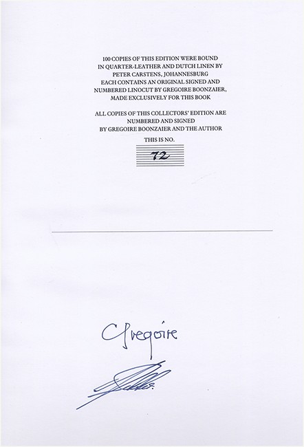 With an original signed and numbered linocut by Gregoire Boonzaier made exclusively for this book.