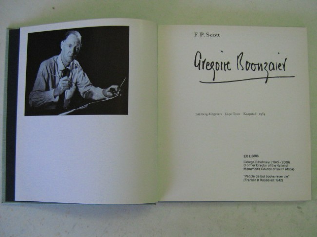 An unblemished copy of this scarce monograph of the artist whose influences included Pieter Wenning, Edward Roworth and Gwelo Goodman, Kottler, etc... and other contemporaries were Hugo Naude, Caldecott, Amschewitz, Spilhaus and Maggie Laubser, Van Wouw, etc... but Percival Small was probably the most influential in encouraging the impressionist style of of Boonzaier\'s work. The book contains 8 full colour plates, and around a hundred b/w reproductions of his work. The book is in near fine condition, pale green linen cloth boards with a reproduction of the artist\'s signature on lower front cover; pages slightly yellowed with age, no bumps, page edges very clean, and neat printed stamp on lower right of title page, which reads \"EX LIBRIS George Hofmeyr (1945-2009) (Former Director of the National Monuments Council of South Africa) - \'People die but books never die\' (Franklin D.Roosevelt 1942)\'\"