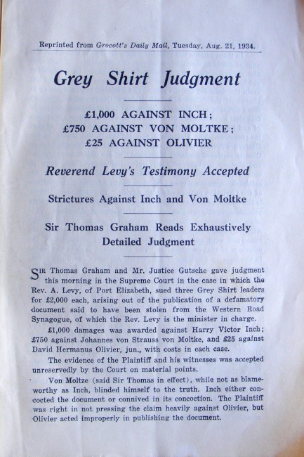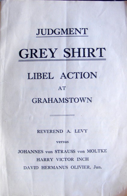 The judgement arose from a case in which the Rev. A.Levy, of Port Elizabeth, sued three Grey Shirt leaders, arising out of the publication of a defamatory document said to have been stolen from the Western Road Synagogue, of which the Rev. Levy was the minister in charge.