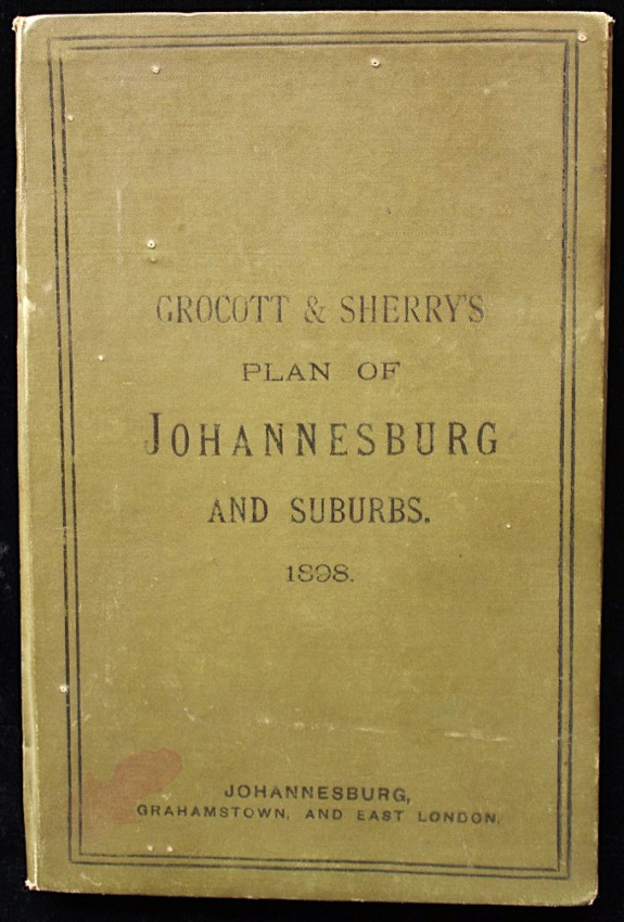 Publisher's green cloth-covered card binding enclosing a fold-out map of early Johannesburg.