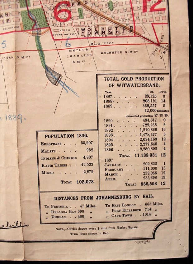 Includes a table of information at bottom right corner relating to the population demographics of Johannesburg in 1896, the total Gold production of the Witwatersrand from 1887 to 1897, and information regarding the distances by rail to South Africa's other major centres of the period.