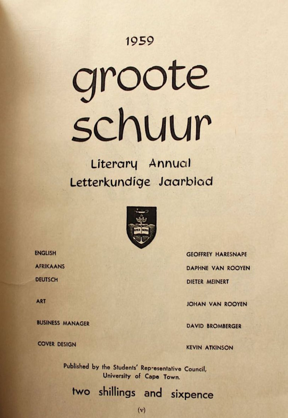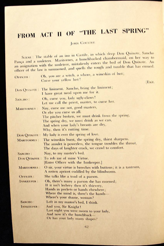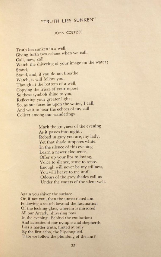 A very significant student publication as it features the first work in print of 2003 Nobel laureate, J. M. Coetzee. He is also one of the very few authors who has won the Booker Prize twice. Coetzee's contributions to this volume include a three-page poem "Truth Lies Sunken", and a four-page excerpt from a verse drama titled "The Last Spring". He was eighteen years old at the time and wrote as John Coetzee. His first book (Dusklands) would only appear fifteen years later.