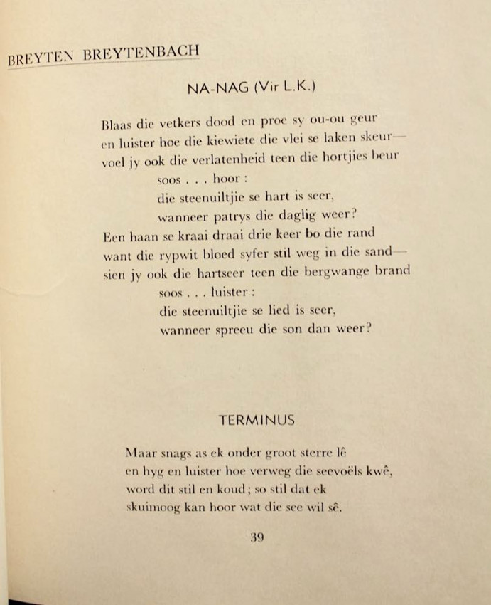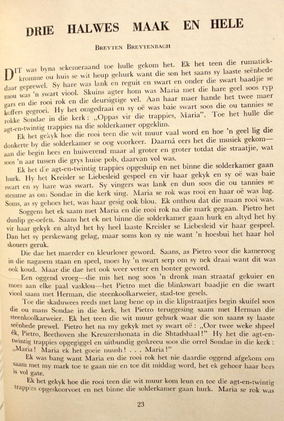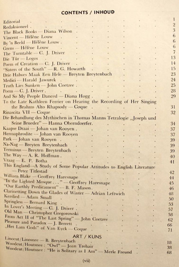 This publication also includes some of the earliest work in print of Breyten Breytenbach. His contributions included prose Drie Halwes Maak Een Hele (Three Halves Make A Whole), two poems Na-Nag and Terminus, and a linocut on page 18.