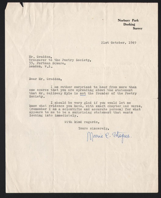 Tls from Marie Stopes (1880-1958) birth control pioneer, dated 21st October 1949