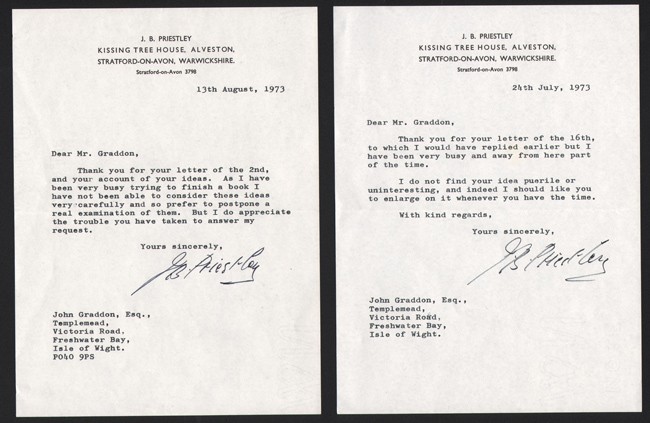 2tls from J.B. Priestly (1894-1984), author, dated 24th July & 13th August 1973. Seemingly not on poetry.