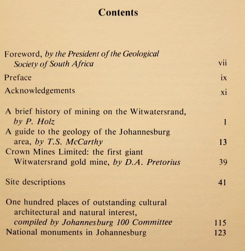 Contains a brief history of mining on the Witwatersrand; A guide to the geology of the Johannesburg area; a brief history of Crown Mines Limited - the first giant Witwatersrand gold mine, detailed descriptions of the sites of geological and mining interest in the Johannesburg area with accompanying figures and colour photographs.