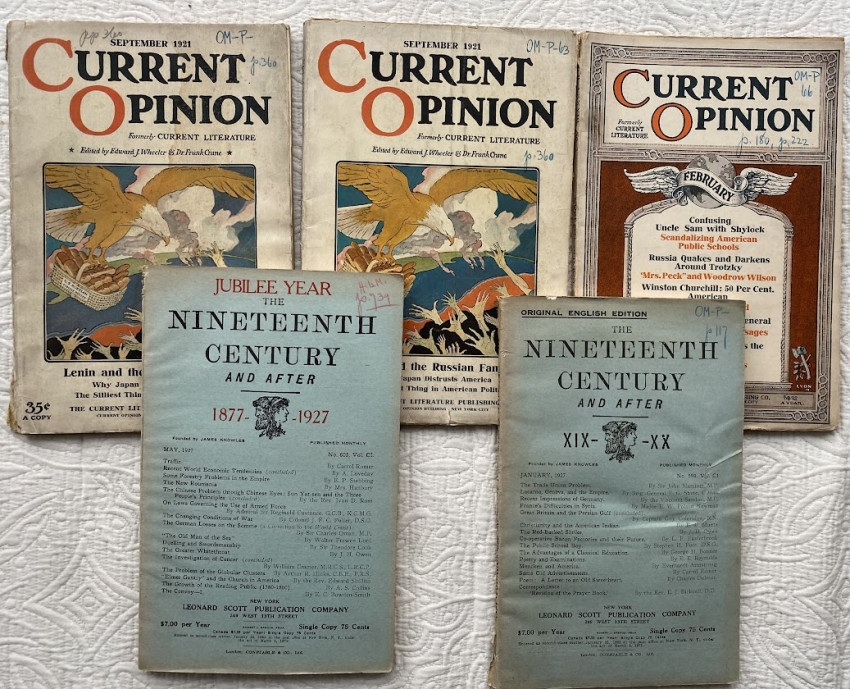 10.Current Opinion. June 1919, Sept. 1921 (2 copies), Feb. 1925. 4 issues (1 duplicate).