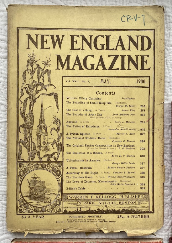 1.New England Magazine Vol.XXII, No.3. May 1900. Octavo. Wrappers (soiled). ‘Auroral. A Poem’ by Mencken is on p.275.