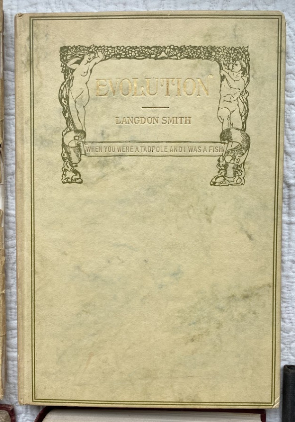 7.Evolution: A Fantasy by Langdon Smith. Boston: John W. Luce & Co ., 1909. Octavo. First edition. Boards (rodent damage to both boards). “The Philosophy of Friedrich Nietzsche,” by Mencken facing verse XIV. Fray B2
