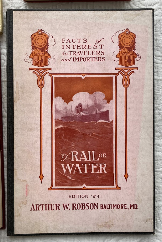 15.By Rail or Water published annually … vol. No 13. 1914 edition [Facts of Interest to Travelers and Importers]. Baltimore: Arthur W. Robson, [1913?]. “Strange, far-off places.” pp. 25-6. Octavo. Cloth with paper panel on upper cover (slight discoloration to paper panel, otherwise excellent). Frey B6.