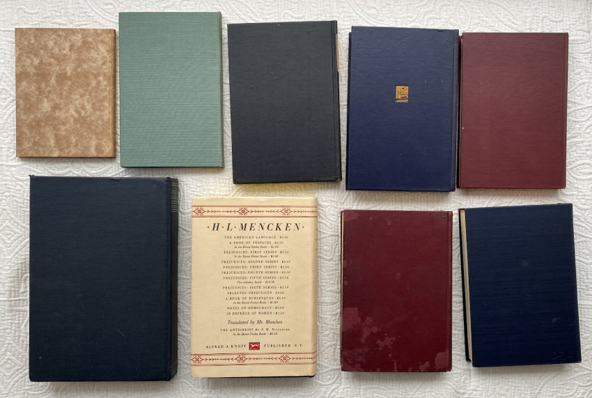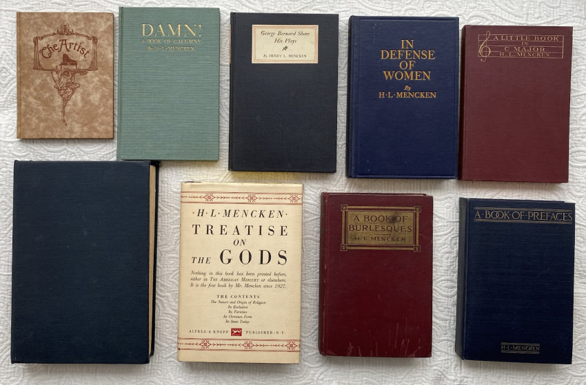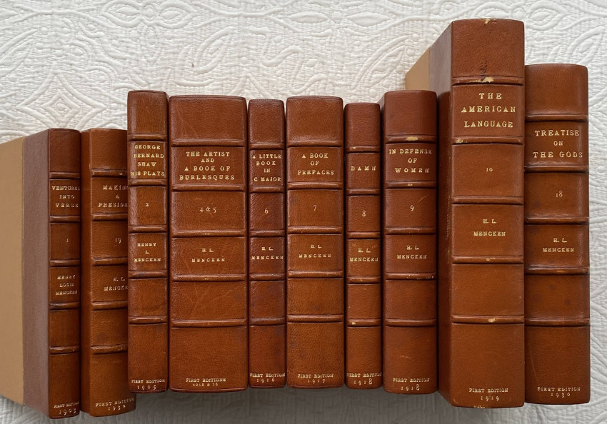 Henry Louis MENCKEN (1880-1956). [Selection of works]. New York [and elsewhere]: 1905-1930. 9 works, in nine volumes, in 8 boxes, various sizes. Various original bindings, all nine works with cloth chemises, all in individual custom box-form two-part slipcases (with two exceptions, see below). Provenance: Alexander F. Haas collection (each slipcase blocked in gilt with owner’s name).