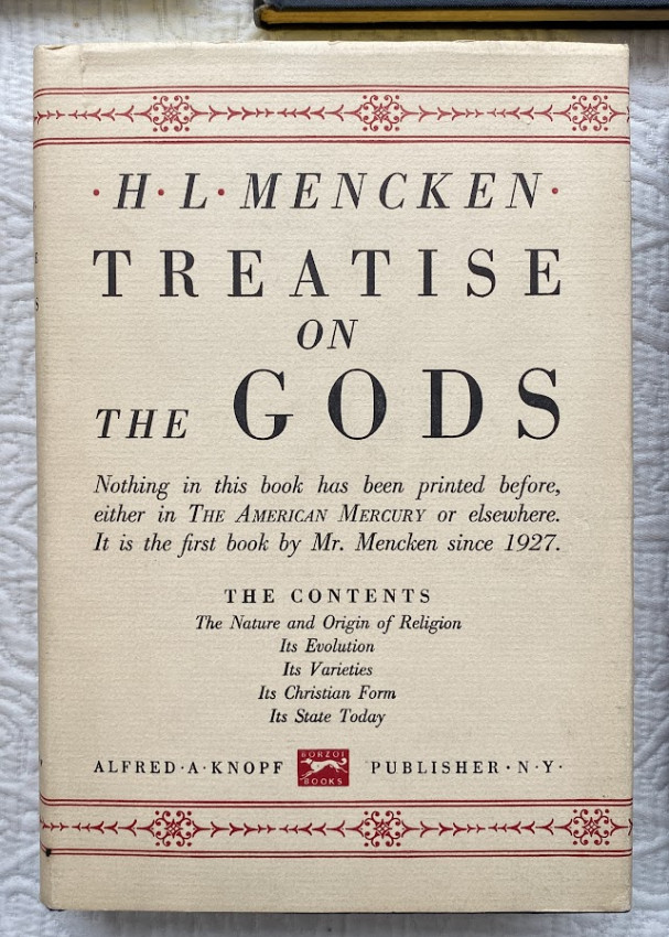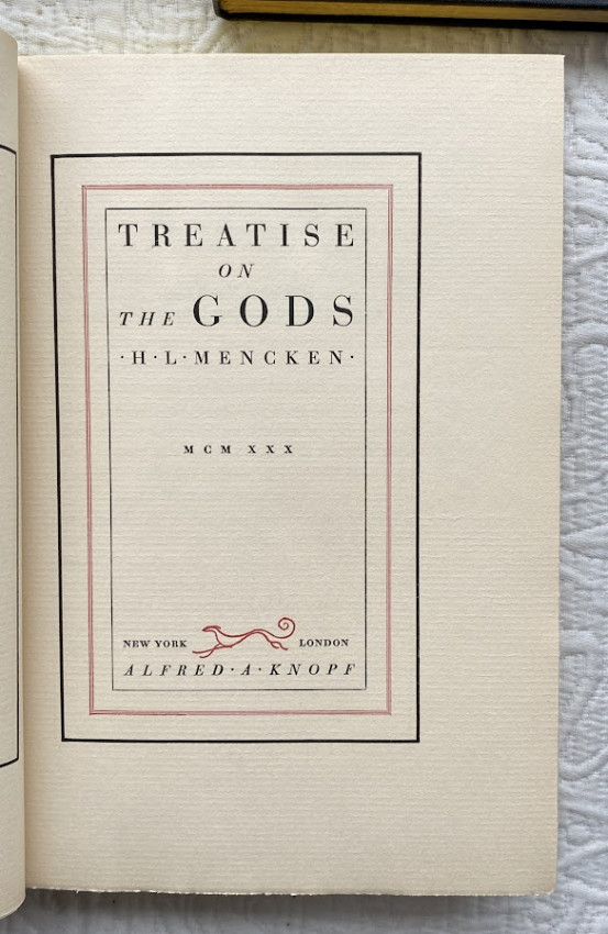 9.Treatise on the Gods. New York: Alfred A. Knopf, March 1930. Octavo. Boxed. “First and second printings before publication”. Blue cloth, d/j. (One small split to the d/j, otherwise excellent).