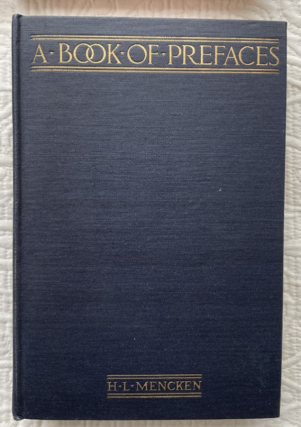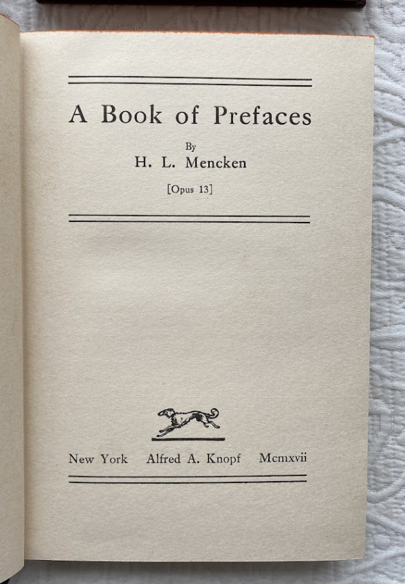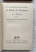 5.A Book of Prefaces (Opus 13). New York: Alfred A. Knopf, 1917. Octavo. Boxed. First edition. Original blue cloth, gilt lettered, edges cut, the top red-stained, no d/j but otherwise excellent. Frey 7a.