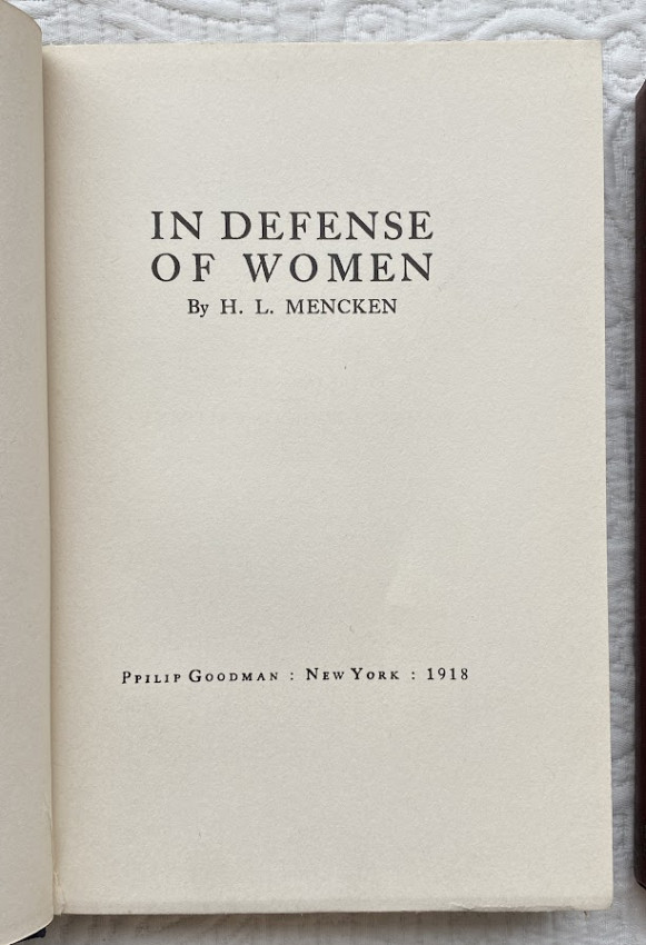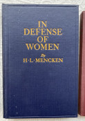 7.In Defense of Women. New York: Knopf, 1918. Small octavo. Boxed. First edition. Blue cloth, gilt lettering, no d/j otherwise excellent. Frey 9a.