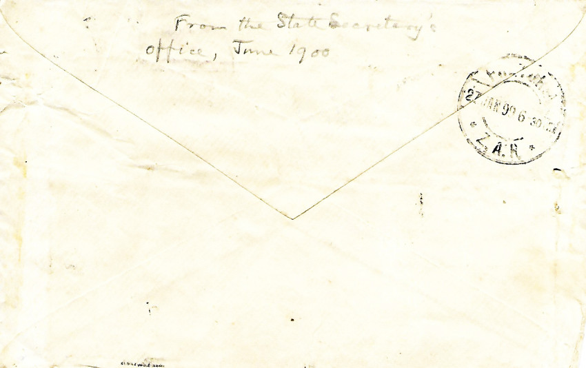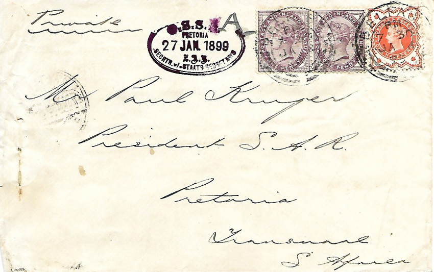This is an original hand addressed envelope (opened at the top) addressed to "Mr. Paul Kruger/President S.A.R./Pretoria/Transvaal/S.Africa." with "Private" written at the top of the envelope. The envelope is rubber stamped as coming from the Office of the State Secretary, is dated 27 Jan 1899 and bears three contemporary cancelled postage stamps. I have not been able to identify the handwriting but as ex Orange Free State President F.W. Reitz was the State Secretary at the time and in view of the fact that this was a personal communication, it is more than possible that the addressor was Reitz himself. Regretfully the contents of the envelope have been removed but still an interesting ephemeral, autograph and philatelic item.