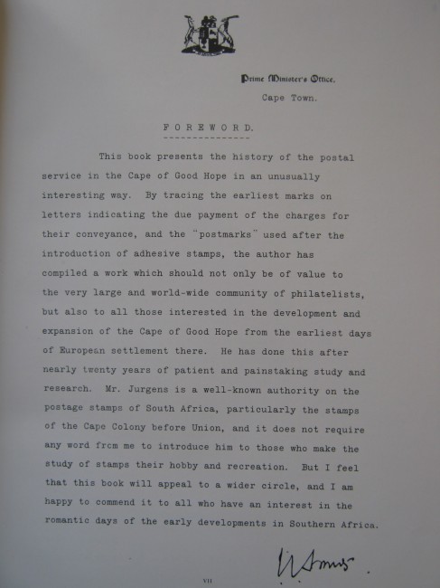 General Smuts contributed the Foreword from the Prime Minister\'s Office (\"I am happy to commend [the book] to all who have an interest in the romantic days of the early developments in Southern Africa\"), while L B Goldschmidt, a philatelic colleague, and H J Lenton, the Postmaster-General, also contributed letters welcoming the book. Goldschmidt wrote: \"Mr Jurgens possesses a collection of Cape philatelic material that for interest is without rival; he has so closely applied himself to his hobby that he now ranks as one of the chief authorities on the stamps of the Cape of Good Hope.\" Lenton wrote: \"It has been a matter of regret that the Post Office official records have been very little able to assist him, and I think that this book will be an important record for the Post Office itself.\"