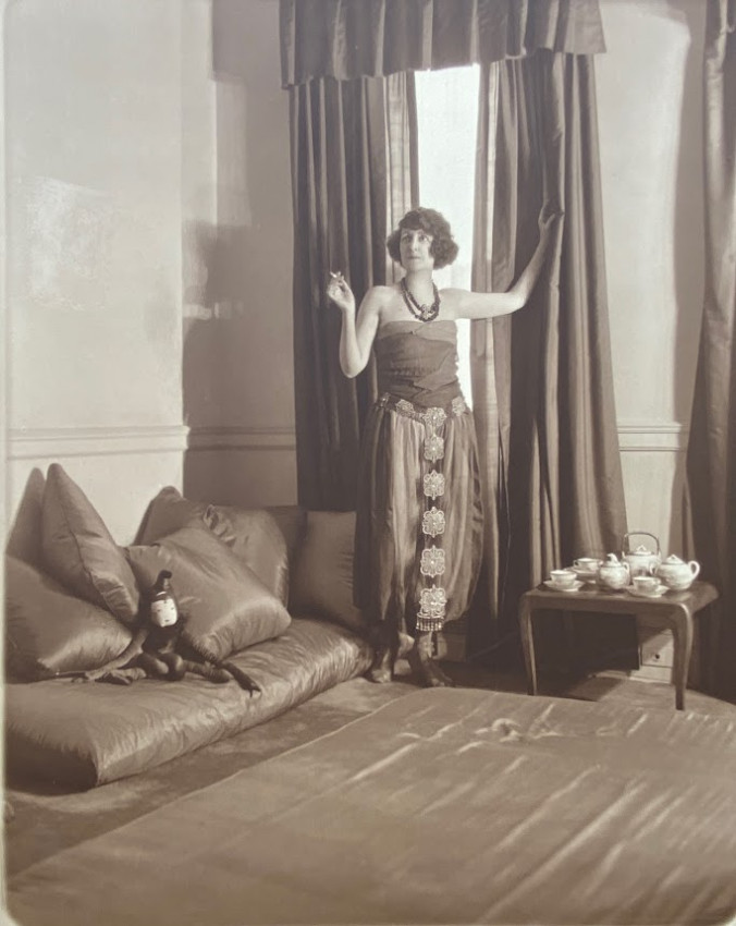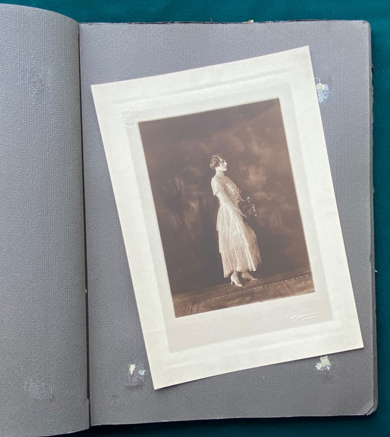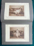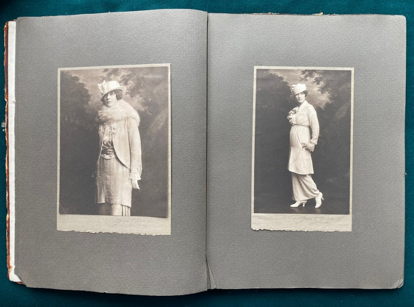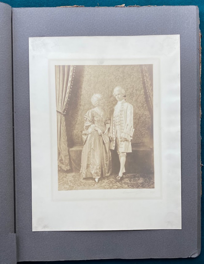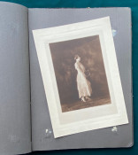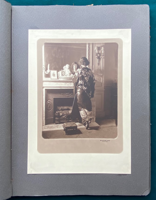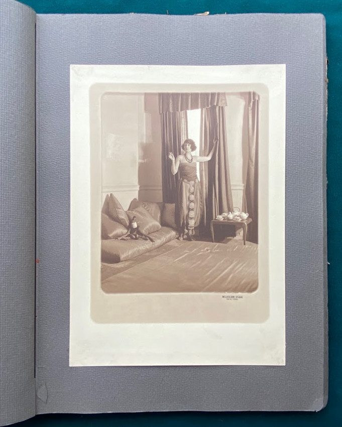 New York ‘Society’ photographs: a collection of eleven photographs of two (or possibly three) women in high fashion outfits, in fashionable interiors, all within a single album. New York: [undated, but circa 1915-1925]. Folio (18 x 14in: 458 x 355mm). 11 photographs (13 ¾ x 10 3/4in; 350 x 174mm. and smaller), on custom mounts tipped into album, or, tipped directly into the album. (Two loosely inserted). Contemporary brown leather, the upper cover blocked with a large highly-elaborate gilt panel, with gilt surround, the lower cover similarly blocked in blind (worn, splits, leather detached form boards, lower board deatached from spine).