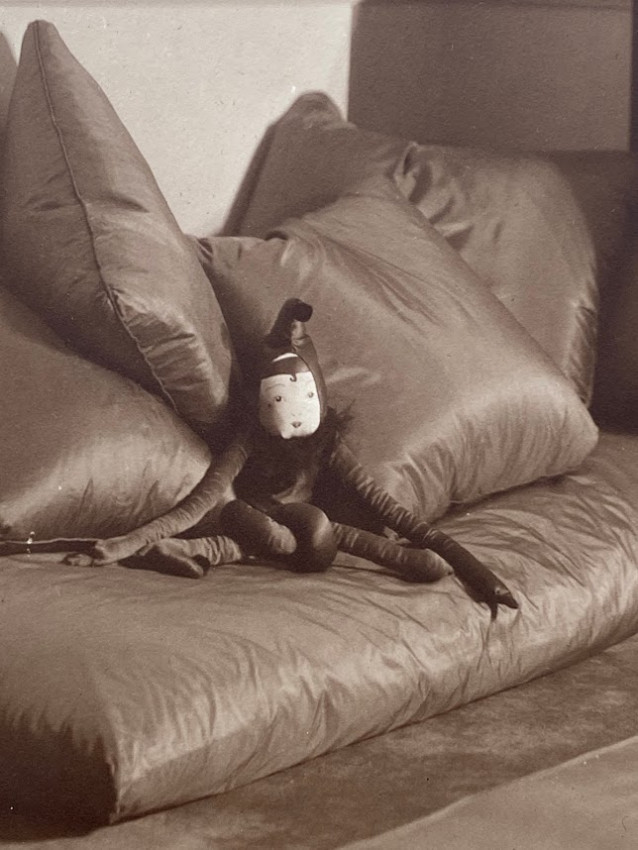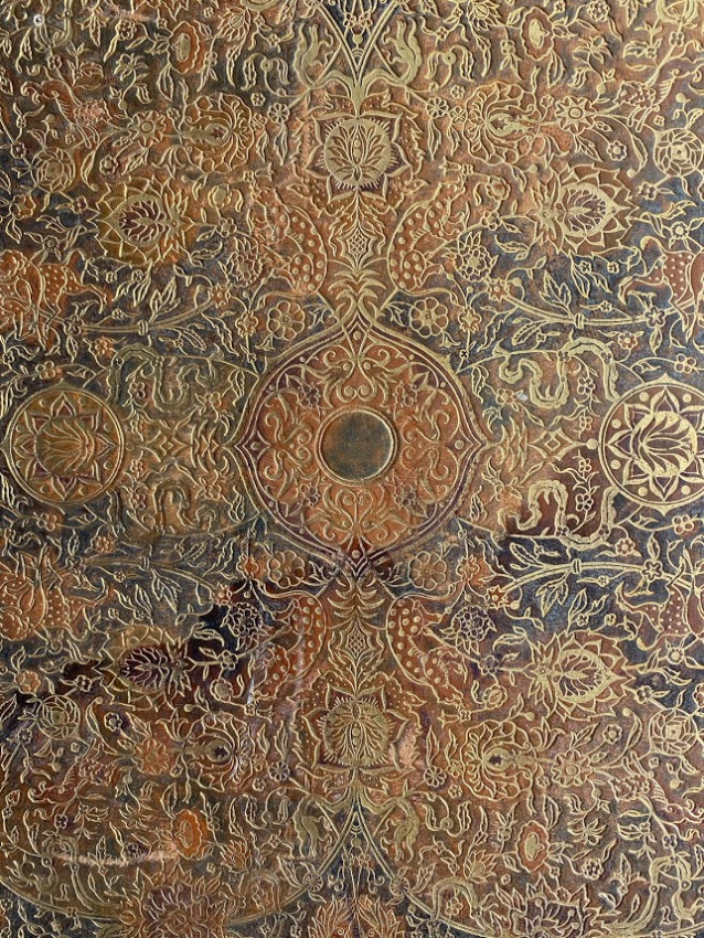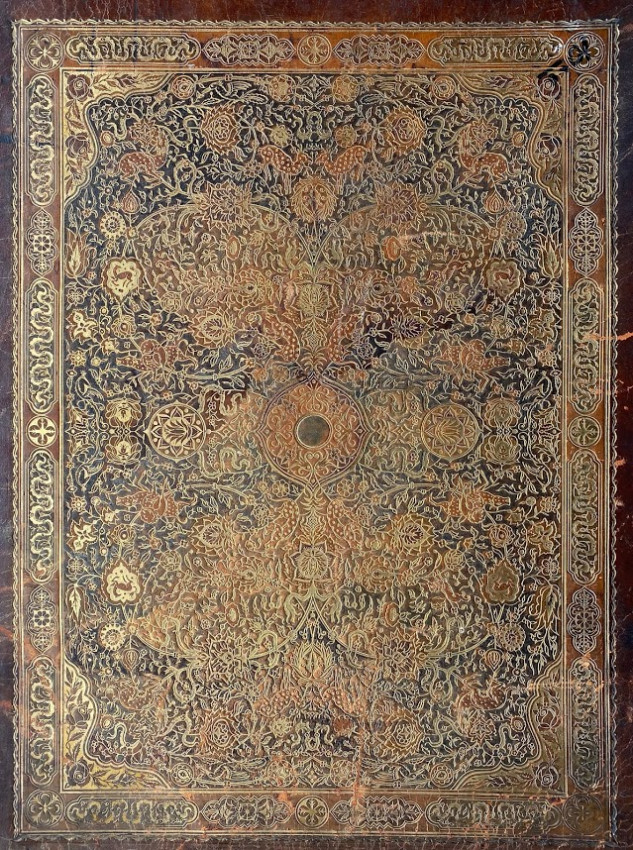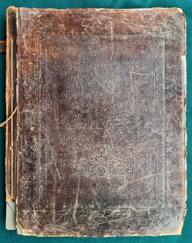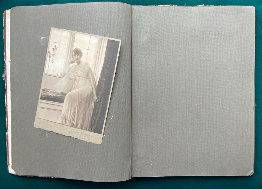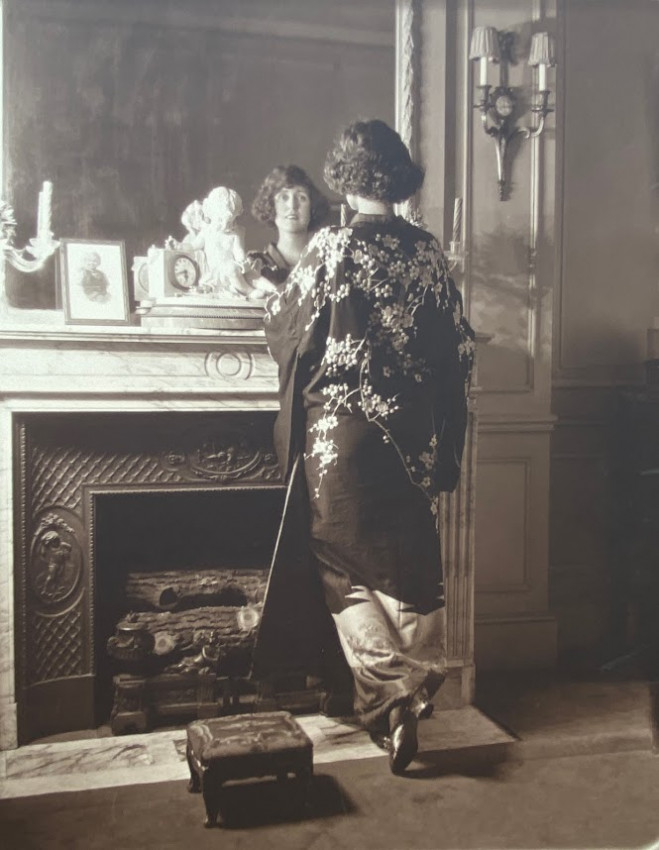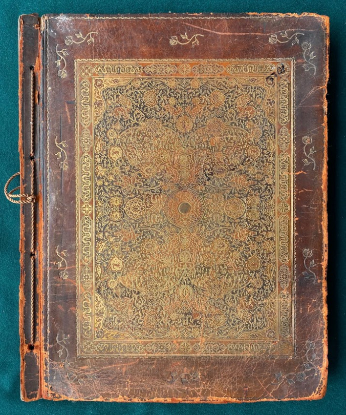 New York ‘Society’ photographs: a collection of eleven photographs of two (or possibly three) women in high fashion outfits, in fashionable interiors, all within a single album. New York: [undated, but circa 1915-1925]. Folio (18 x 14in: 458 x 355mm). 11 photographs (13 ¾ x 10 3/4in; 350 x 174mm. and smaller), on custom mounts tipped into album, or, tipped directly into the album. (Two loosely inserted). Contemporary brown leather, the upper cover blocked with a large highly-elaborate gilt panel, with gilt surround, the lower cover similarly blocked in blind (worn, splits, leather detached form boards, lower board deatached from spine).