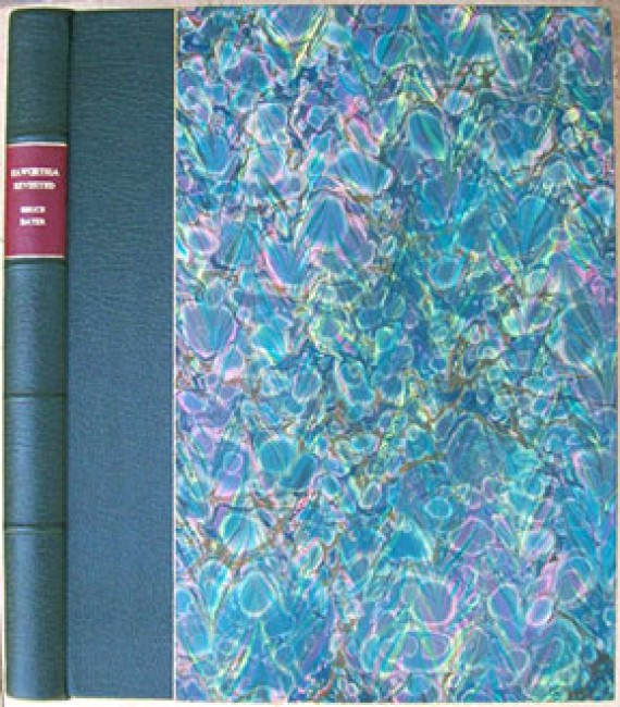 Hand bound by Peter Carstens with a dark green leather spine with a red title label and hand marbled paper covered boards.