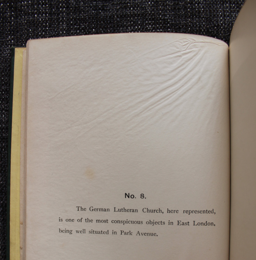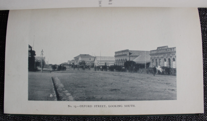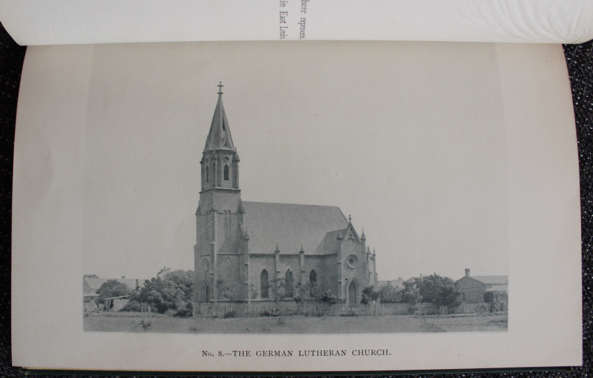 24 black and white pictures and their descriptions on the tissue papers inbetween. Description of each photograph is printed on the tissue paper. Green cloth with letters in golden gilt to the front board. Inscription in ink on ffep.Pictures of the Buffalo Harbour, wharves and railway, Oxford street, Queen's park, German Lutheran Church, the pump dredger Sir Gordon and more.