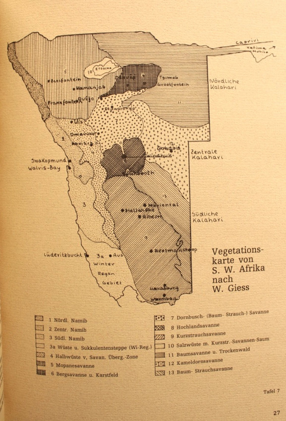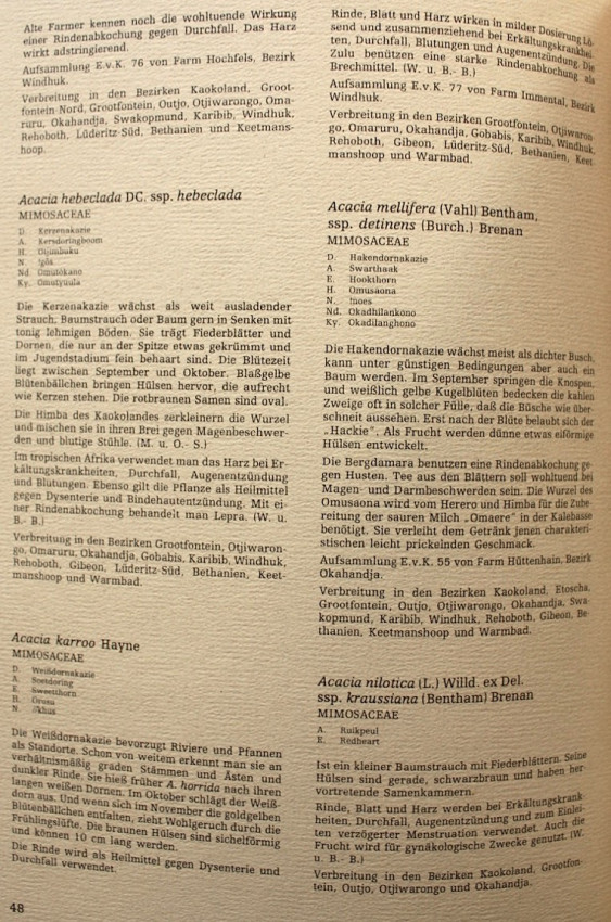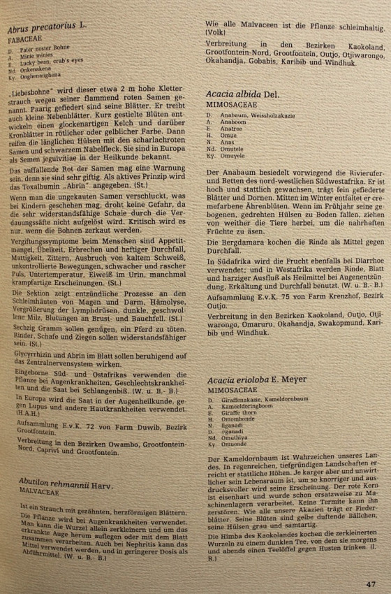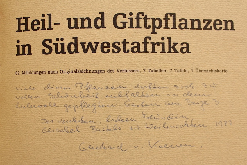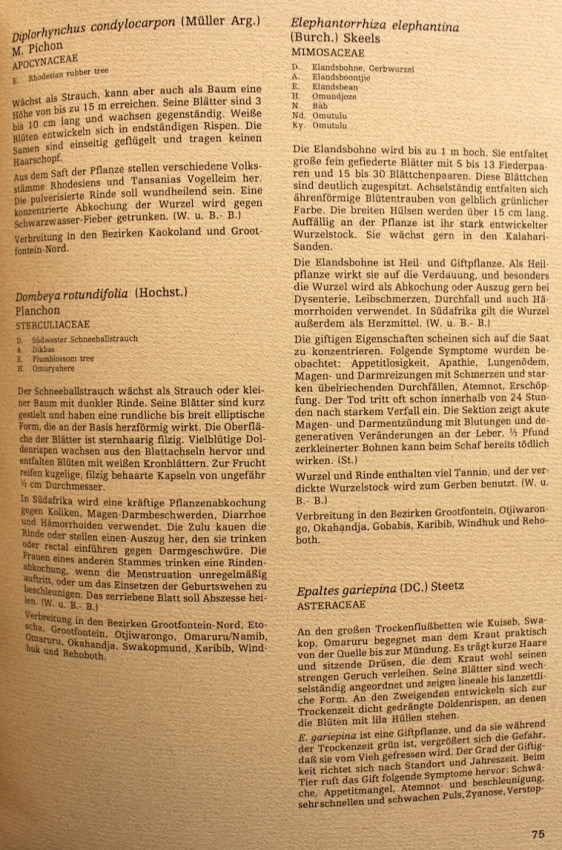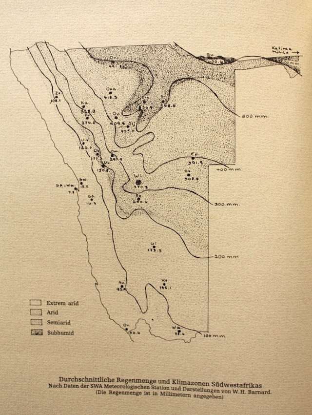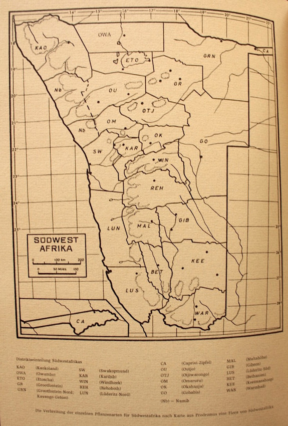 Contains a map of South West Africa showing all the districts, meteorological tables and charts, a geological map, and a vegetation map. This is followed by the author's illustrations of the different ecosystems found in South West Africa, and finally, the descriptions of the healing and poisonous plants of the country, arranged alphabetically according to their Latin names, with accompanying illustrations.