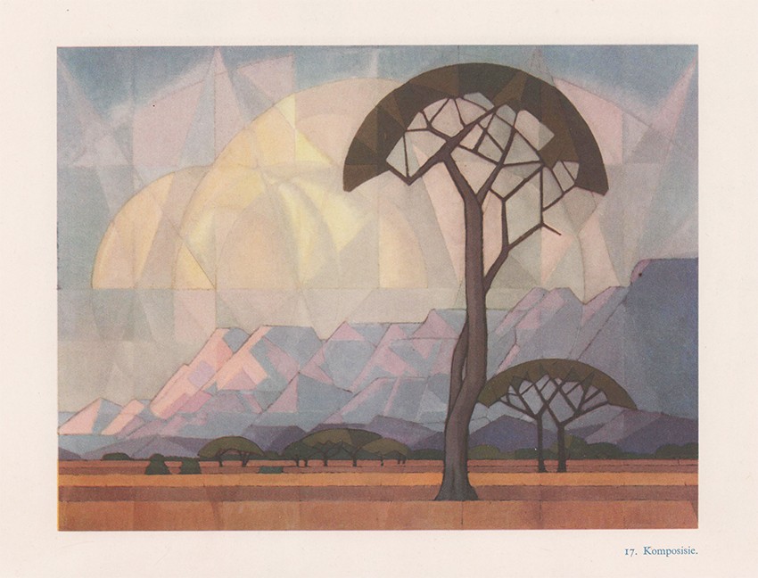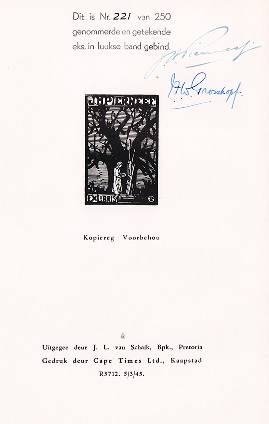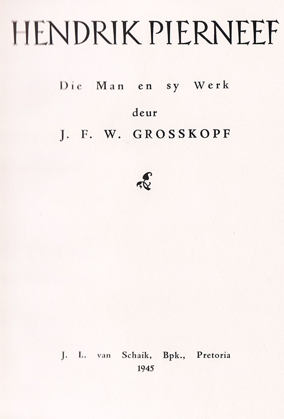 First edition. 24 pages of text, frontispiece of Pierneef, 31 oil paintings – 4 in full colour plates, 6 watercolours, 4 etchings, 20 woodcuts, 13 black and white drawings, original pictorial green cloth gilt on cover and spine, a very good copy.
