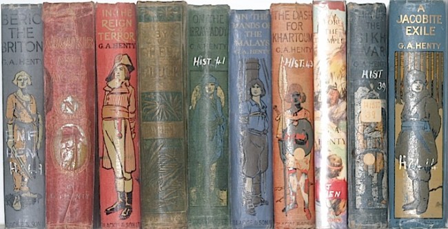 A collection of 10 titles (juvenile adventure stories) by G.A. Henty in Fair condition: By Sheer Pluck (Blackie & Son, London, c.1884); In the Reign of Terror (Blackie & Son, London, c.1922); At Aboukir and Acre, A Story of Napoleon's Invasion of Egypt (Blackie & Son, London, c.1899); Beric the Briton, A Story of the Roman Invasion (Blackie & Son, London, c.1925); A Jacobite in Exile (Blackie & Son, London, 1909); Through the Sikh War (Blackie & Son, London, c.1912); For the Temple (Latimer House, London, 1955); The Dash for Khartoum, a Tale of the Nile Expedition (Blackie & Son, London, c.1892); In the Hands of the Malays (Blackie & Son, London, c.1933), and; On the Irrawaddy (Blackie & Son, London, c.1909). Most titles are ex library with usual markings. Boards worn, foxing on first and last leaves of most titles. Henty wrote 122 works of historical fiction from 1867 to 1906.