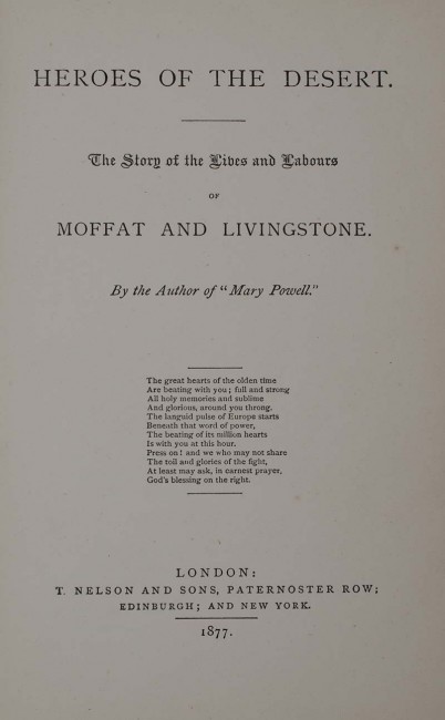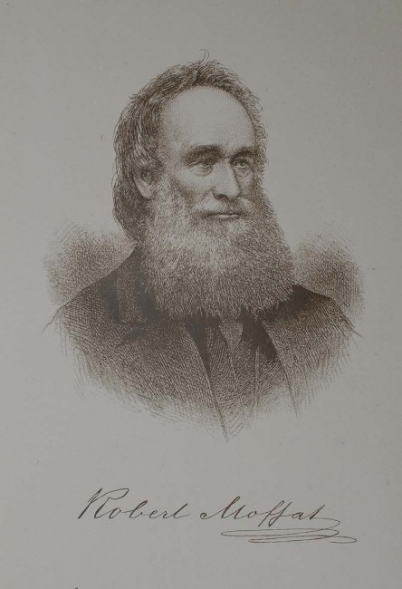 There are two detailed b/w portraits of David Livingstone and Robert Moffat; both portraits also have tissue guards. Binding is good and the book is in good condition considering its age.