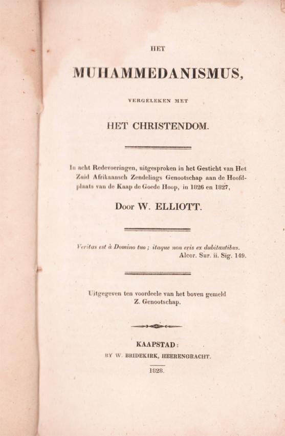 William Elliott 22 September 1792 – 25 November 1858 was sent out to the Cape Colony in 1820 by the London Missionary Society. That same year a William Elliott, presumably him, applied to the government for permission to open a classical and commercial academy, but nothing seems to have come of this. He joined the church of John Philip in Cape Town, but was soon transferred to the Comoro Islands. However, as there was no opening for him there he returned to the Cape in 1822. Returning to England in 1824 he was ordained in Sheffield "to the work of a Christian missionary to the Malays and other heathens in and about the Cape of Good Hope" (The Evangelical Magazine and Missionary Chronicle, February 1825, p. 70). He returned to Cape Town in 1825 under the patronage of the South African Missionary Society, with the encouragement and assistance of the London Missionary Society. He was at home in Greek, Hebrew, Latin, Dutch and English, and was also a musician. In addition to some sermons he published a series of eight lectures on a comparison between Islam and Christianity (Cape Town, 1828).http://www.s2a3.org.za/bio/Biograph_final.php?serial=861