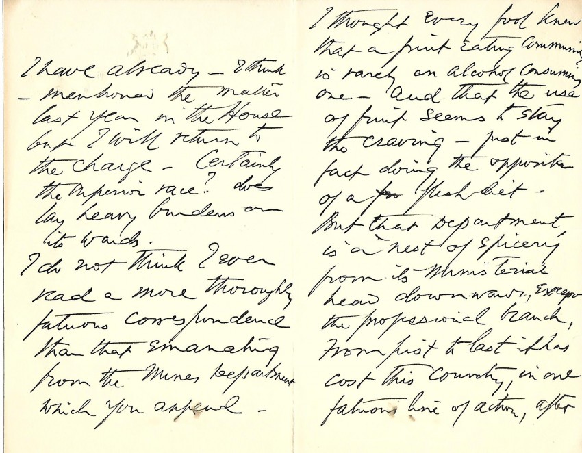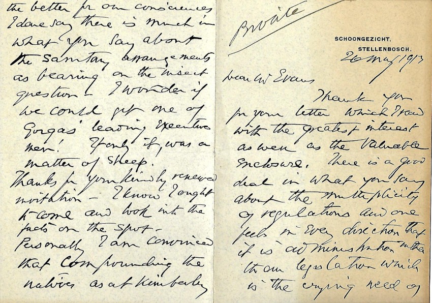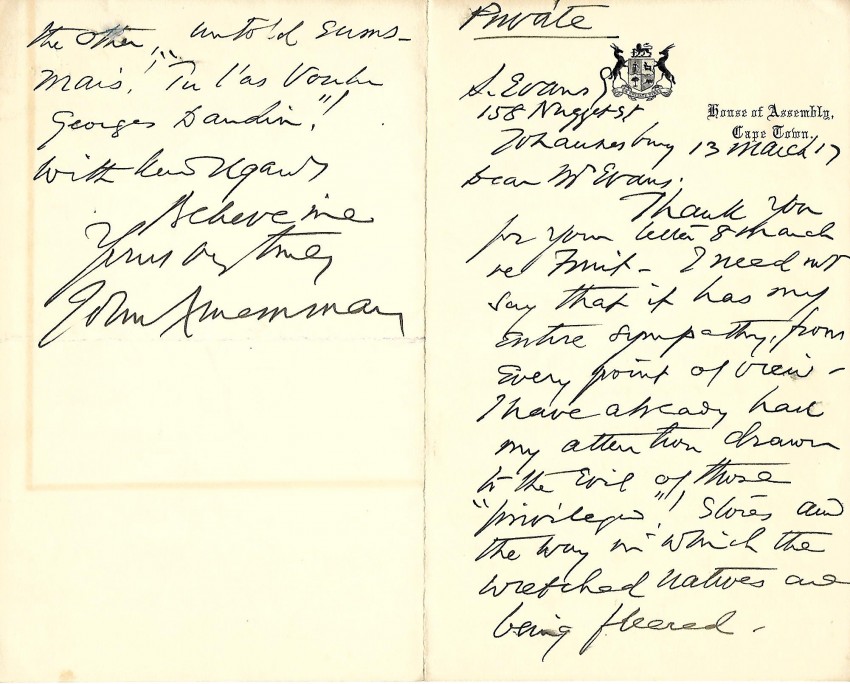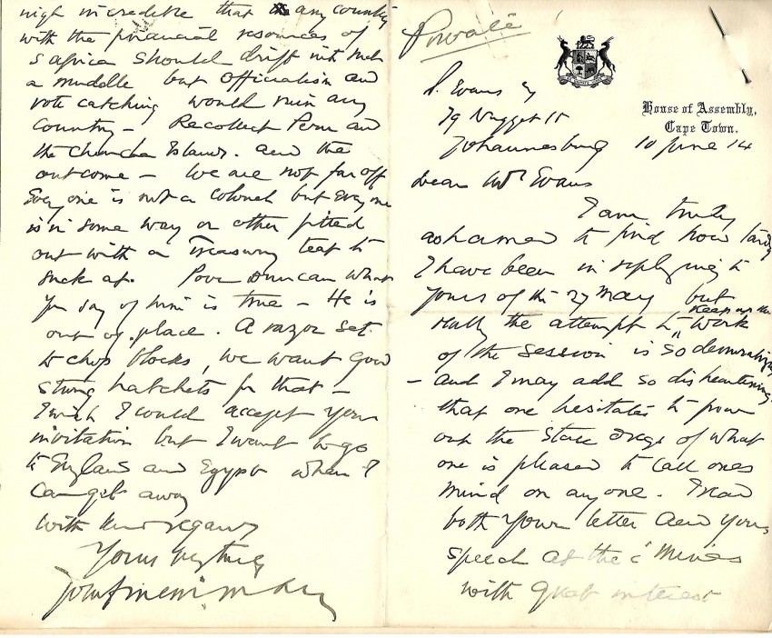 An extensive correspondence of 42 signed autograph letters from John X. Merriman, the last Prime Minister of the Cape of Good Hope, and Samuel Evans, the Chairman and M.D. of Crown Mines. Dated from 26th. May 1913 until 22nd. July 1922 and written either from Schoongesicht or Parliament with several on House of Assembly, Union of S. Africa letterheads. The letters, on different size pages, vary in length form in from 1 to 8 pp. Together circa 172 hand written pages, jam packed with information. Several of the letters are accompanied by (? secretarial) ribbon typescript transcripts or in some cases secretarial shorthand notes. Two additional Merriman to Evans letters seem to lack the original handwritten copies and are present only as typescript transcripts. The archive also includes a more or less equivalent number of carbon typescript copies of Evans’ detailed letters to Merriman, rendering the dialogue between the two of them complete. A remarkable archive dealing with, amongst others, matters political, economic, mining, racial (expressing some liberal ideas) including mining staff and conditions, the Mineworkers strike of 1913 and the Rand Rebellion of 1922. The correspondence is too extensive to cover adequately, but below please read a few extracts of the Merriman letters which will give the flavour of the communication.