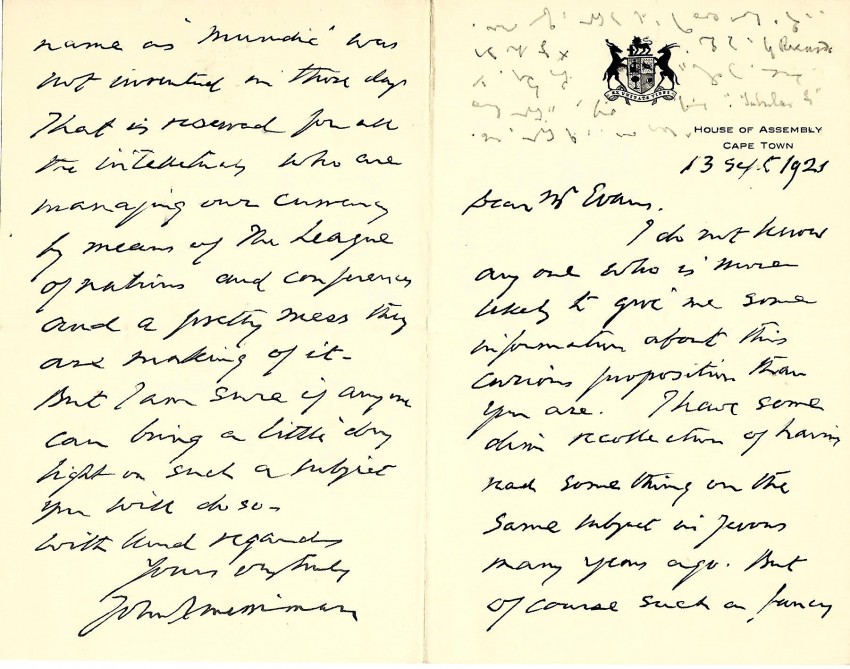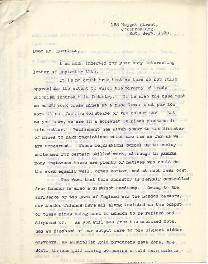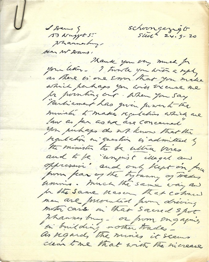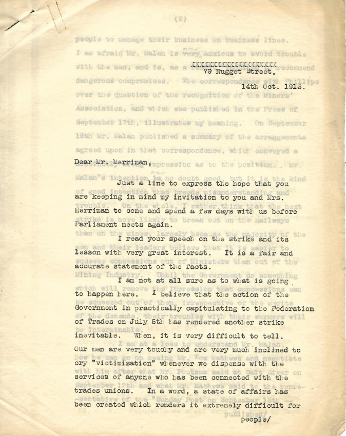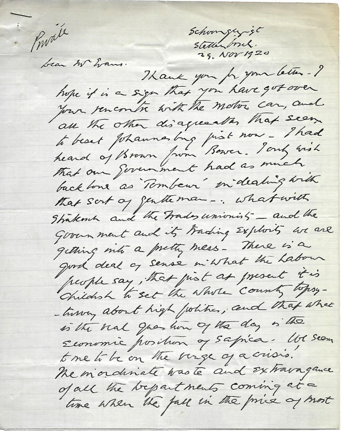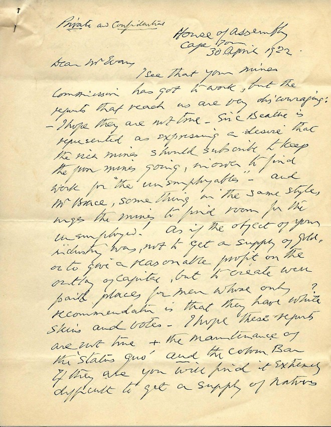 - "30th. April 1922." A remarkable letter dealing with the aftermath of the Miner's Strike. "I am so possessed with fear when I see the course that is being steered that I cannot refrain pouring forth my alarm to the only man who seems to me to have resolution enough to tackle the situation. We have in our Native population the best asset any country ever possessed in cheap, intelligent, docile labour. We have deliberately set ourselves to destroy this asset by reducing them to a senile caste…….under the domination of uneducated, unskilled and indolent men whose only claim lies in their colour. How long will this system last? And what will be the result when the inevitable catastrophe comes?"