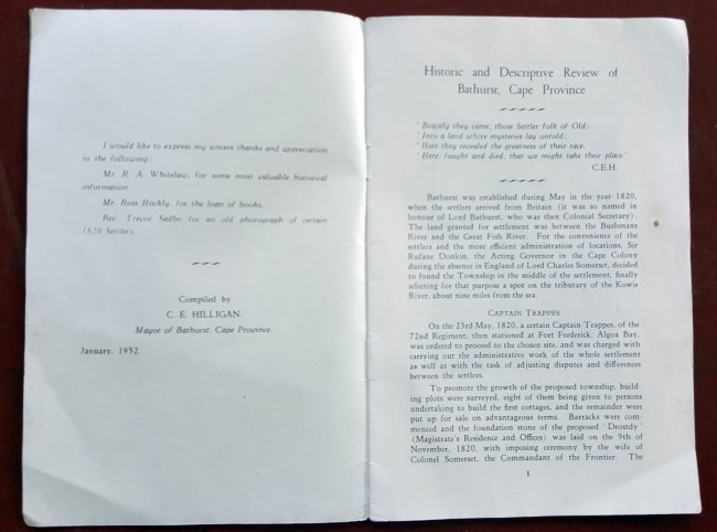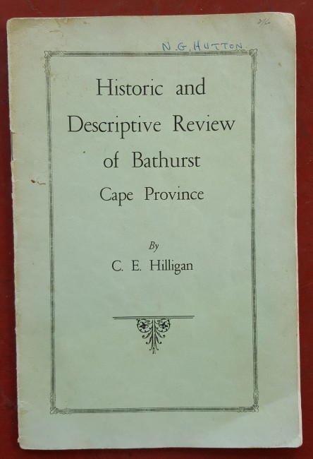 18p. Black and white photographs. Pale green paper wraps, small pamphlet. Owner's name on front cover. Some marks to covers. Commemorating the landing of Jan van Riebeeck at the Cape of Good Hope in 1652, this pamphlet looks at the 1820 settlers and provides an interesting history of Bathurst in the Eastern Cape.