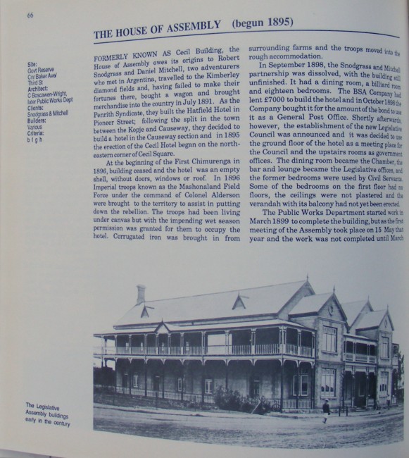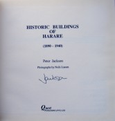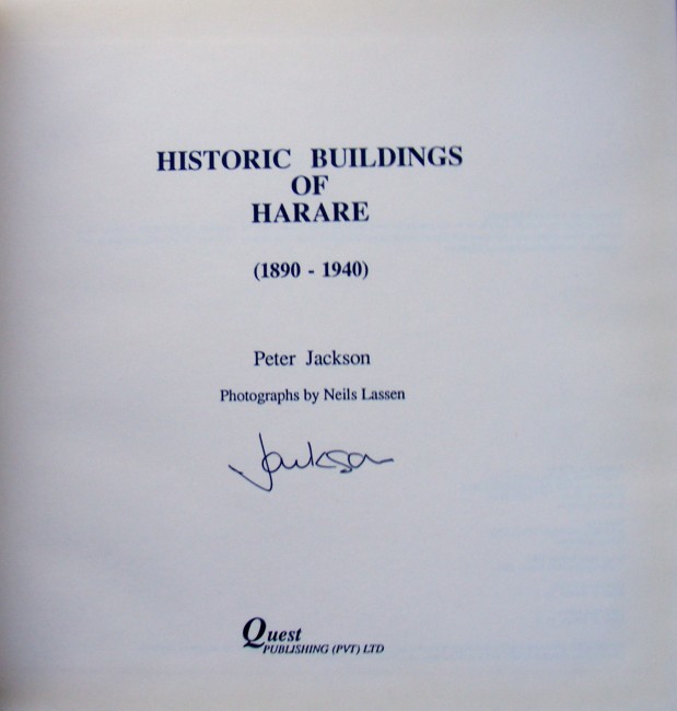 Signed by author, Historic Buildings of Harare (1890-1940), Quest Publishing, photographs by Neils Lassen, illustrated with historic architectural images, town plans, historical perspective, architectural development, guide to buildings, destroyed buildings illustrated, glossary of architectural terms, references and sources,index, maps, 134 pages, 225 x 225mm, condition:very good.
