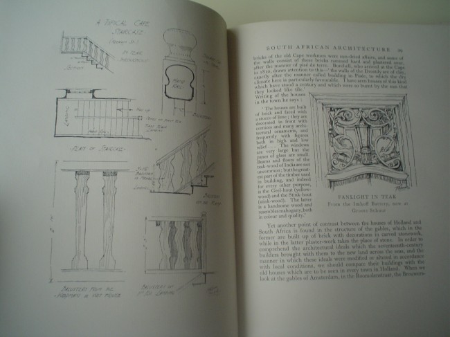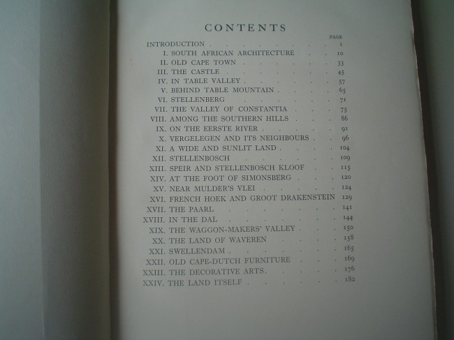 191 pages, colour frontispiece and 10 colour plates after Gwelo Goodman, numerous black & white plates and text illustrations, blue gilt decorated cloth. Chapters on Constantia, the Castle, Table Valley, Stellenberg, Eerste River, Vergelegen, Stellenbosch, Simonsberg, Mulders Vlei, Groot Drakenstein, Waggon-Maker's Valley, Waveren, old Cape Dutch furniture and the land itself.