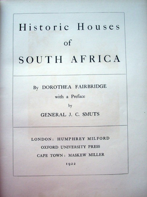 This author of this book, essentially an illustrated study of old Cape Dutch farmsteads and houses, was the daughter of the distinguished lawyer, scholar and Cape Town parliamentarian, Charles Fairbridge. In 1855 Fairbridge moved a proposal in the Legislature to inquire into the establishment of the South African Museum. He was also a trustee of the Sir George Grey bequest to the South African Library.