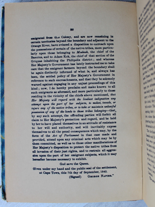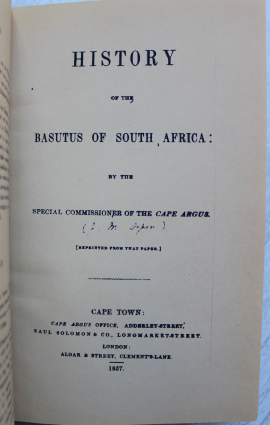 First published in 1857 by Saul Solomon & Co. The editors state that they "neither take the Boer view nor the Missionary view" with regard to Basutoland matters, but they trust that " England will return to a true sense of their responsibilities she once undertook, and still owes to the native tribes over the Orange River." (Mendelssohn's South African Bibliography volume 2 page 125)