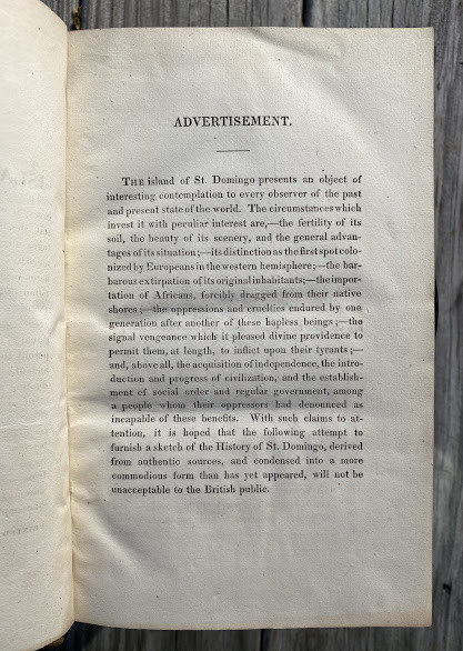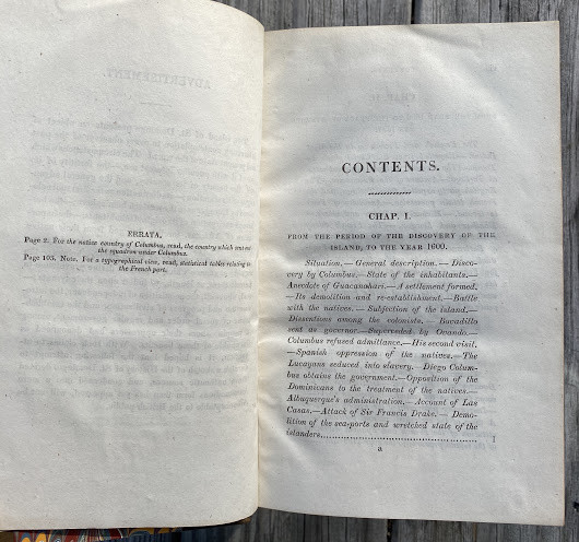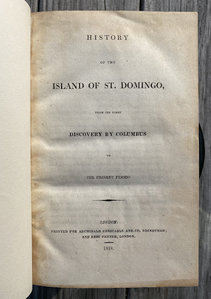 History of the Island of Saint Domingo from its first Discovery by Columbus to the present period. London: printed for Archibald Constable & Co. of Edinburgh, and Rest Fenner of London, 1818. Ocatvo (8 x 5 ¼ in; 203 x 133mm). Pp. [i-]xiv; [1-]446, including pp. 387/388 a folding leaf with letterpress tables recto and verso. Condition of contents: some very light toning, split to section of the folding table, otherwise excellent. Modern half calf over marbled paper-covered boards, red leather label to spine, lettered in gilt. Condition of binding: excellent.
